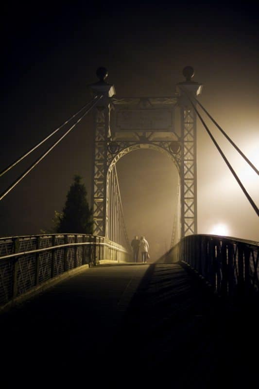 It was a freezing cold night in Chester and it also looked like it was going to be a foggy night and so I grabbed my gear and headed out towards the Groves in Chester. It’s an amazing part of Chester by the river that during summer is full of buskers, ice cream stands, people rowing on boats and generally having a good time, but this cold night it was freezing and hardly anyone about! I originally went out to take some HDR night shots around that area and then a couple walked past me, I quickly grabbed my camera, set the ISO to 1600 and aperture priority at f2.8 (the fastest my lens will go) and then (handheld) fired off a loads of shots as they walked away from me over the bridge. I was very lucky to get one decent shot at 1/6 sec exposure being handheld (good job I hadn’t had a coffee beforehand or my hands would have been shaking!). Very little was done to the image in post processing other than a slight crop.