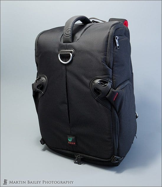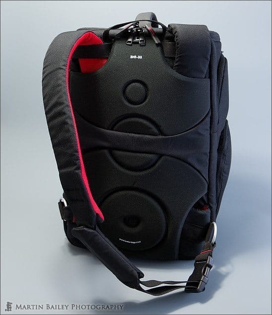 If we turn the bag around, we can see that all of the straps tuck nicely into the protective foam back. This means you can stow away all the straps when traveling, say when you are getting onto an aircraft, and the band across the middle enables you to use the bag with the optional Kata Insertrolley, or you can drop the bag over the handle of a suitcase or other roller bag that you might be using for a business trip for example.