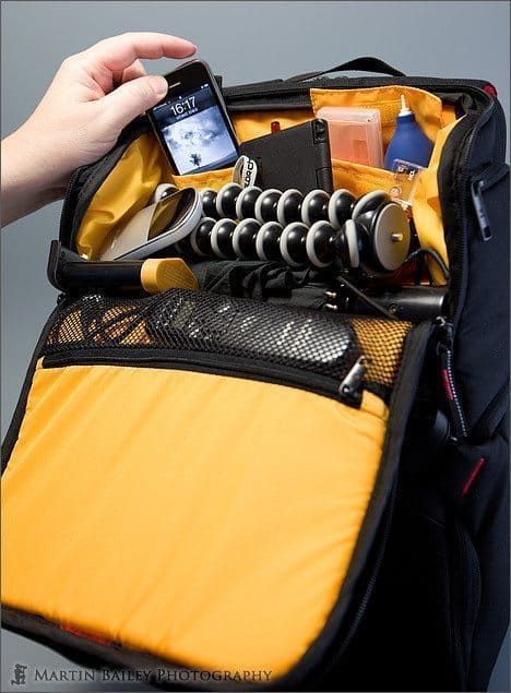 Well, as we can see, there’s a really nice compartment at the top of the 3N1-33 bag, with pockets for a cell phone, pens and other things like a small air blower etc. and you can also drop a GorillaPod in there and small umbrella etc. Of course, you could put a flash in here, and if I really wanted to, I can actually get the 300mm F2.8 lens in this top compartment, but it makes the total bag weight so heavy that it’s difficult to use as a sling. If I really needed to carry that much, gear I’d reach for a larger bag.
