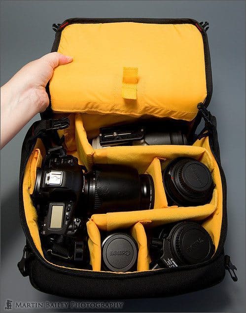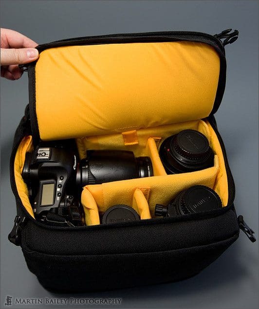 The bag comes with plenty of separators. I’m only using around half of what it comes with here, so if you want to create lots of small compartments, you can. Also, notice that the interior is bright yellow. This might not be to everybody’s taste, but it sure makes it easy to see your gear inside, which I imagine will be especially useful when shooting on a dull day or on a pre-dawn or post sunset shoot.