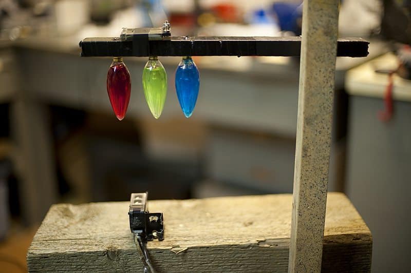 The next day I came up with a crazy thought, why not fill three clear bulbs with Jell-O. That was sure to slow down the pellet. I have to tell you that filling light bulbs with Jell-O is no easy feat. I took a soldering iron andmelted the bottom off the bulbs then drilled a small hole into the filament. After that I took a large marinating needle and filled each bulb with different coloured Jell-O, red, green and blue. Squirting Jell-O through a needle is a very slow and messy process. It took about 25 minutes to do one bulb. I then hung them upside down on a chunk of wood with the electronic eye between the first and second bulb. Well that didn’t work as you can see.