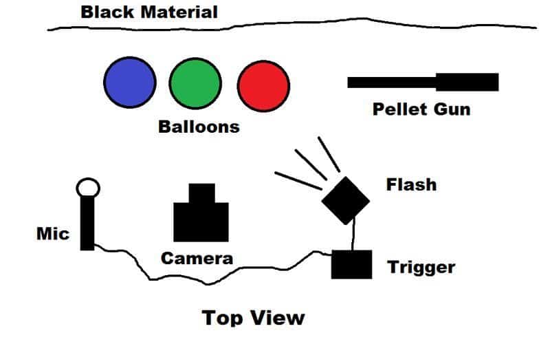 I tested it and it worked perfectly. I could adjust the sound level that triggers the flash with the volume knob on the amp. All that was left was to set it all up. I decided to use balloons as it was a lot easier to clean up. I put a black cloth on the wall. Hung the balloons upside-down held there by little black clips and fishing string. To adjust when the flash fires all you have to do is physically move the microphone closer or further away from the noise. The closer, the sooner it fires. I tried a few test shots and was even able to grab the pellet going through the last balloon.