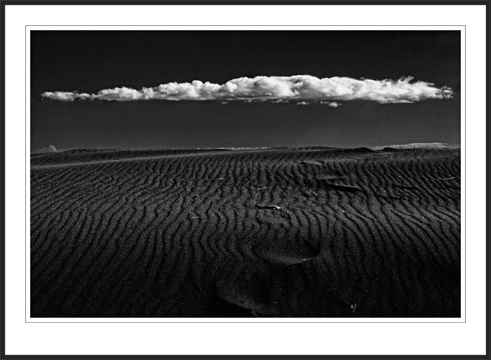In photoshop I used ‘Nik Software’s Silver Efex Pro’ for the b/w conversion and adding grain/noise/contrast etc. For this shot I went as far as isolating the dune, sky and cloud for different amounts of grain, noise & contrast. For the sand I was after a more hardcore, intense grain, where as the cloud is almost devoid of grain keeping it soft and puffy. Spent around an hour processing.
