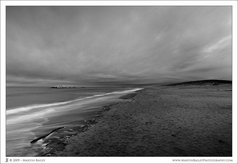 Let’s now take a look at the resulting image which is number 2294 (below). The black and white conversion enabled me to add contrast, and make those wave breakers in the sea to become more of a focal point. It’s not easy to see in the Web version, but in a larger print, these concrete formations actually add quite a bit to the shot. Most of all though, using some strategically placed control points in Silver Effex Pro, darkened down certain parts of the sky and beach, and helped to rescue something from what at first glance could easily have been a very uninspiring shot.