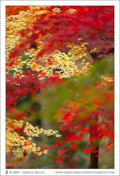 As I walked away though, I felt somewhat saddened, and really wanted to make something of the beautiful yellow leaves, so I started to do what I’d spoken about a number of times, and that’s to look back. We can often think of a scene in a certain way, and especially, once you have what you think is the best photograph that the scene can offer, we walk away. I do though often look back at a subject as I move on, just to make sure that I’m not missing something, and this year, I did that for a little bit longer than I might usually do, and I ended up spotting an angle where there were a number of different coloured trees in a line. The moment I saw it, I knew there was a shot there, so I dropped my tripod down with my 300mm F2.8 lens on it, and started to line up a shot. I raised the tripod a little, and then lowered it a little, so that all of the leaves lined up just right.