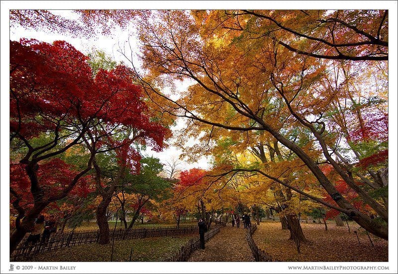 To hopefully help to impress on you what sort of a scene I’d carved this image from, below is a photograph of the wider scene. You can see here though that it’s just a regular park, albeit a very beautiful one at this time of year. You can probably appreciate though that the first photograph we looked at my not have been obvious at all, to the many people that come here at this time of year to photograph these trees. The above photo is of the trees to the extreme right of this image.