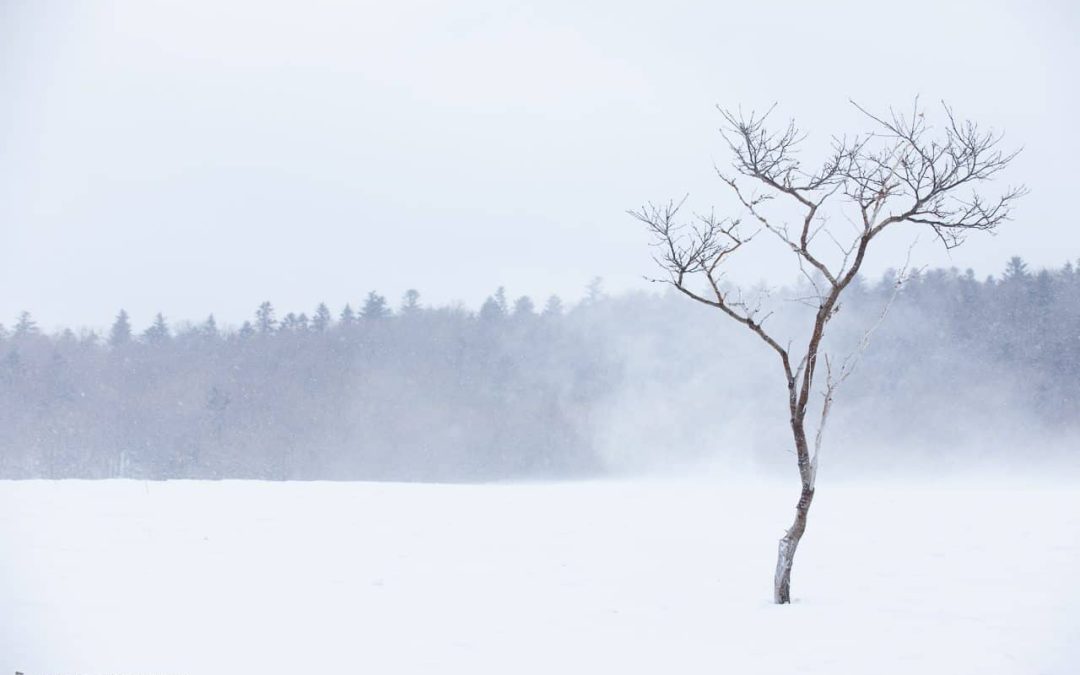 Snow swept up by the wind frames a winter tree.