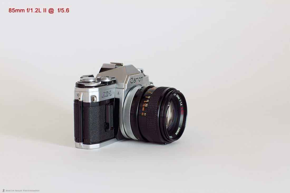 In practical terms, the difference between the minimum focus distance of the old and new 85 mm lenses doesn’t give us the ability to magnify our subject by very much more. Here, in fact (below) is a photo of my old Canon AE-1 camera shot with both lenses at their closest focus distance. The smaller camera is from the old 85mm I measured it as taking up 38% of the frame, compared to the larger semi-transparent camera, from the new 85mm at it’s closest focus distance, which takes up 45% of the frame, so we’re talking about a 7% increase in magnification between the two lenses closest focus distances.