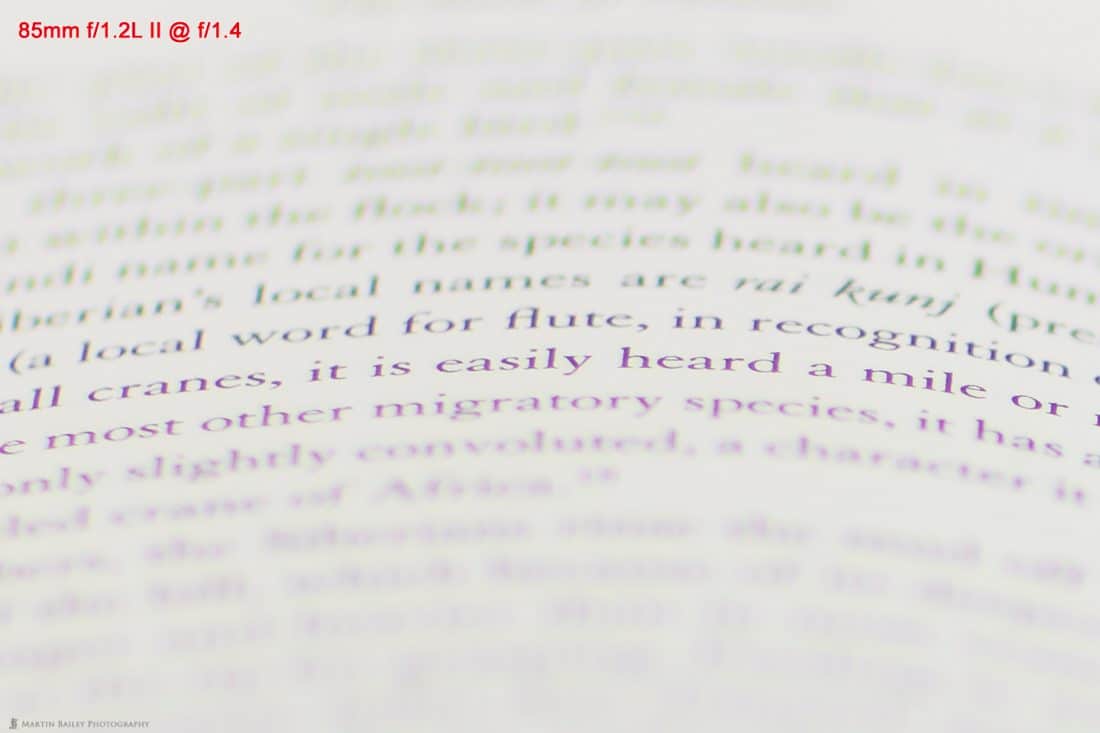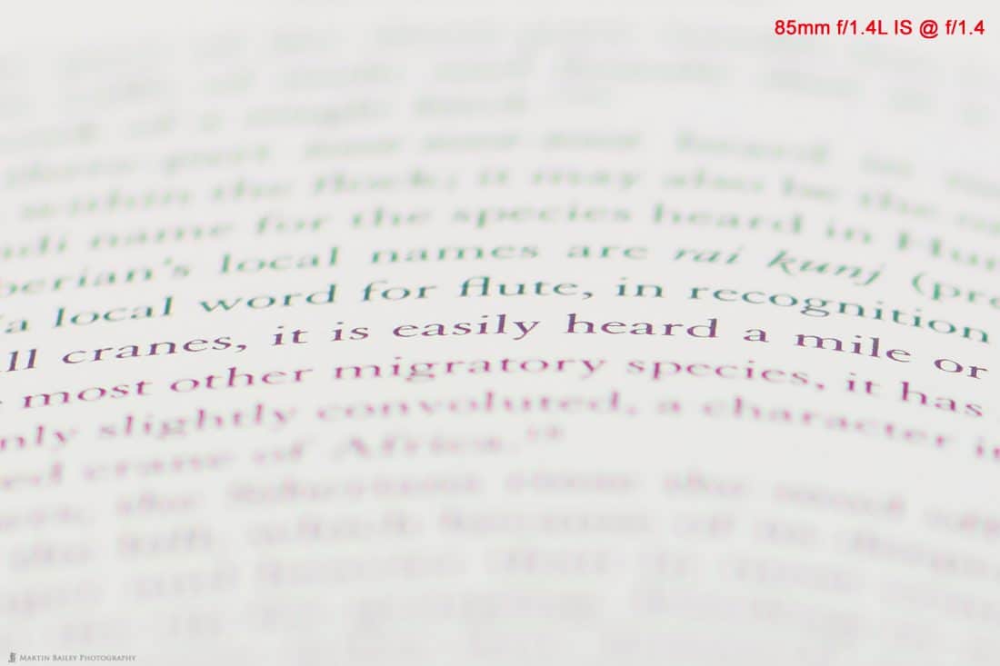 I can see a slight cyan tint in the text above the sharp area, and a slight magenta tint in the foreground text, on both images. The line that is sharp is definitely sharper in the new 85mm f/1.4 lens image though, despite this being shot completely wide open at f/1.4, and that’s pretty impressive. Also, just to reiterate what I said at the start, you can easily see from this image just how shallow the depth of field is when shooting at f/1.4.