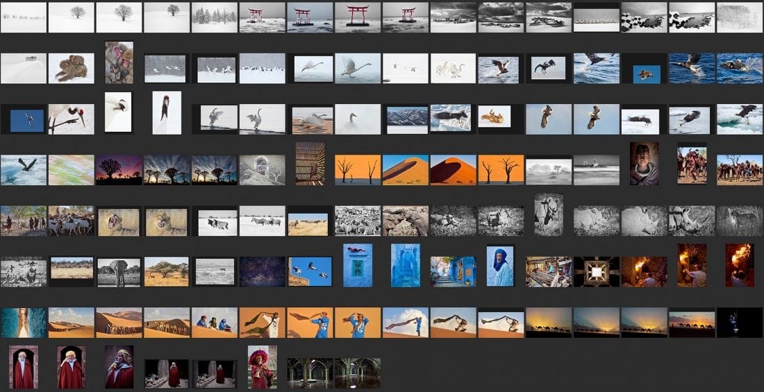 As I start my second pass, the first thing I do is look for groups of similar images. It’s highly unlikely that I will include more than one of the same or similar subject unless the photos are both very special, so I can be pretty ruthless as I look through images of, for example, winter trees, Red-Crowned Cranes, Sea Eagles, and Camels in dunes etc.