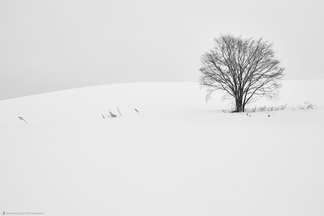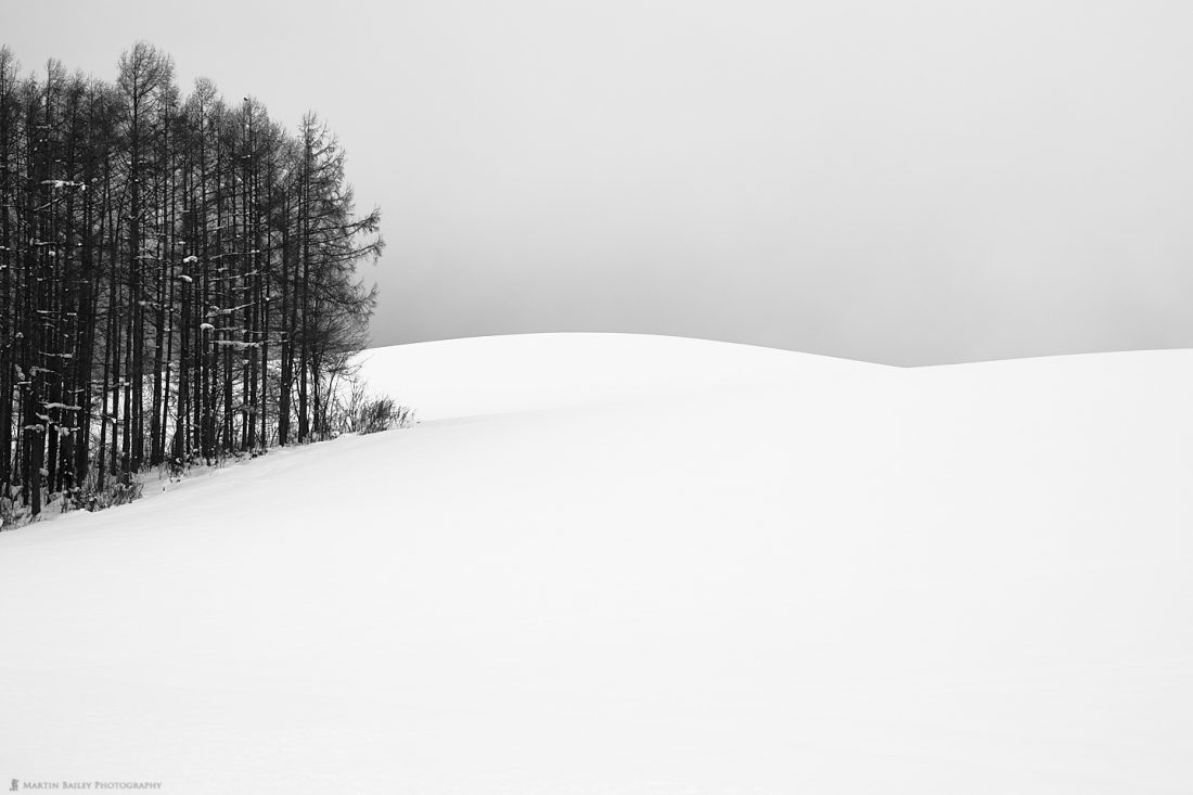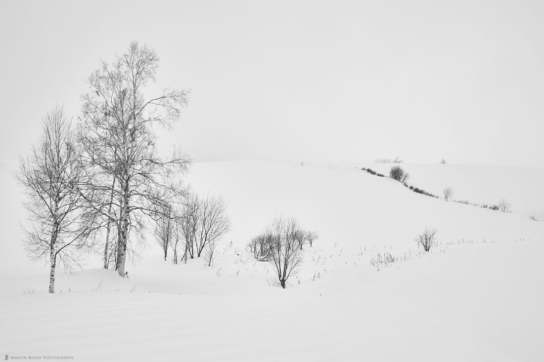 This next image is a take on a subject that I haven’t photographed for a while. When the snow comes in, it completely obscures the distant mountains that are usually visible behind this copse in the hills of Biei, completely minimalizing the scene.