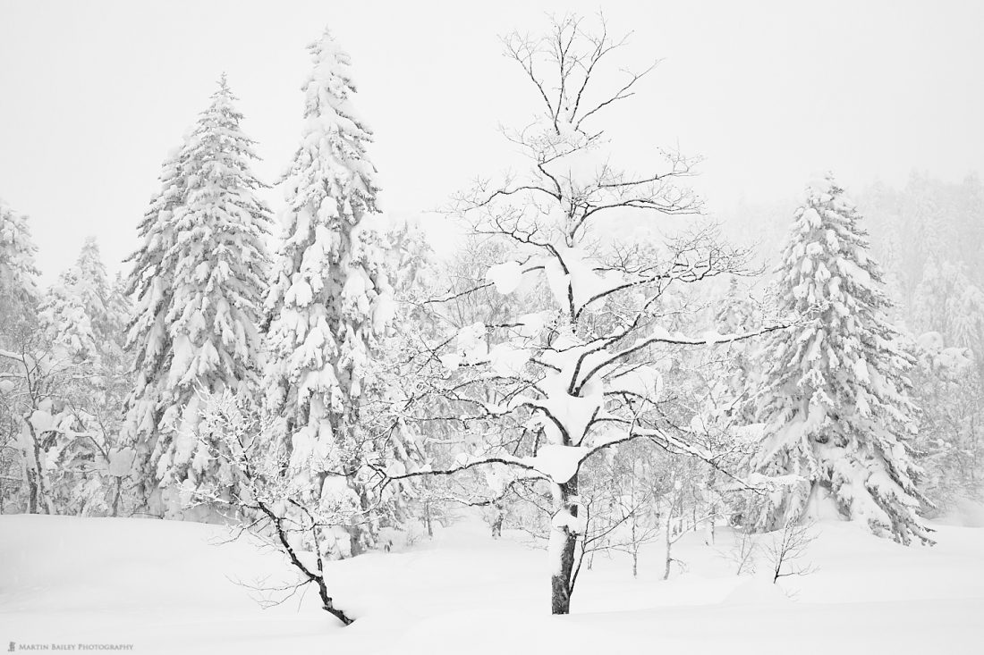 One of my favorite trees is this one with the dark bark, which provides a beautiful contrast against the snow piled up on its branches, and there is a smaller tree now growing next to it. I positioned myself so as to get the Christmas trees in the background nicely framing the foreground dark tree, and left just a little more space either side of these. I shot this at f/14 for a 1/30 of a second at ISO 100, and a focal length of 47mm.