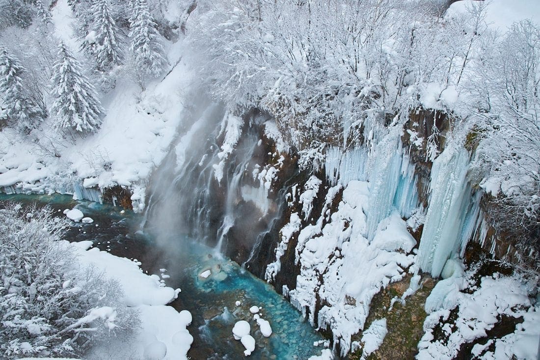 Behind the hotel that we stay in during our three days in Biei, there’s a waterfall called the Shirahige Falls. The water that flows through the falls and river below has a slight blue tint due, I believe, to the mineral content, so it adds a nice splash of color to this magical winter scene. I’ve enhanced the blue slightly here to increase the color contrast.