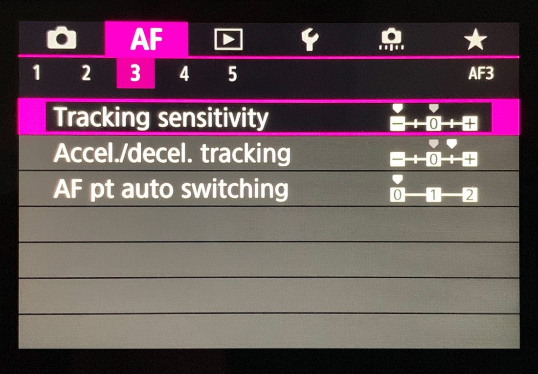 I reduced the Tracking Sensitivity to -2 to help keep the camera locked on to a moving subject. I increased the Acceleration/Deceleration Tracking to +1, to stay with an erratically moving subject, and I generally tend to leave the AF Point Auto-Switching at zero, because increasing this can make the autofocus jump to the background or things that cross in front of your intended subject a little too easily.