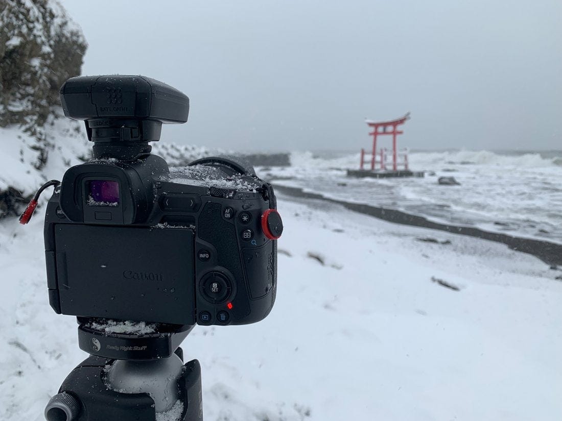 And here is a photo of my EOS R with a decent amount of snow on it, as I shot the previous image. The snow melted occasionally on the top around the LCD and buttons, and I wiped it off from time to time because I don’t trust the weather-sealing on any Canon camera that is not 1-series.