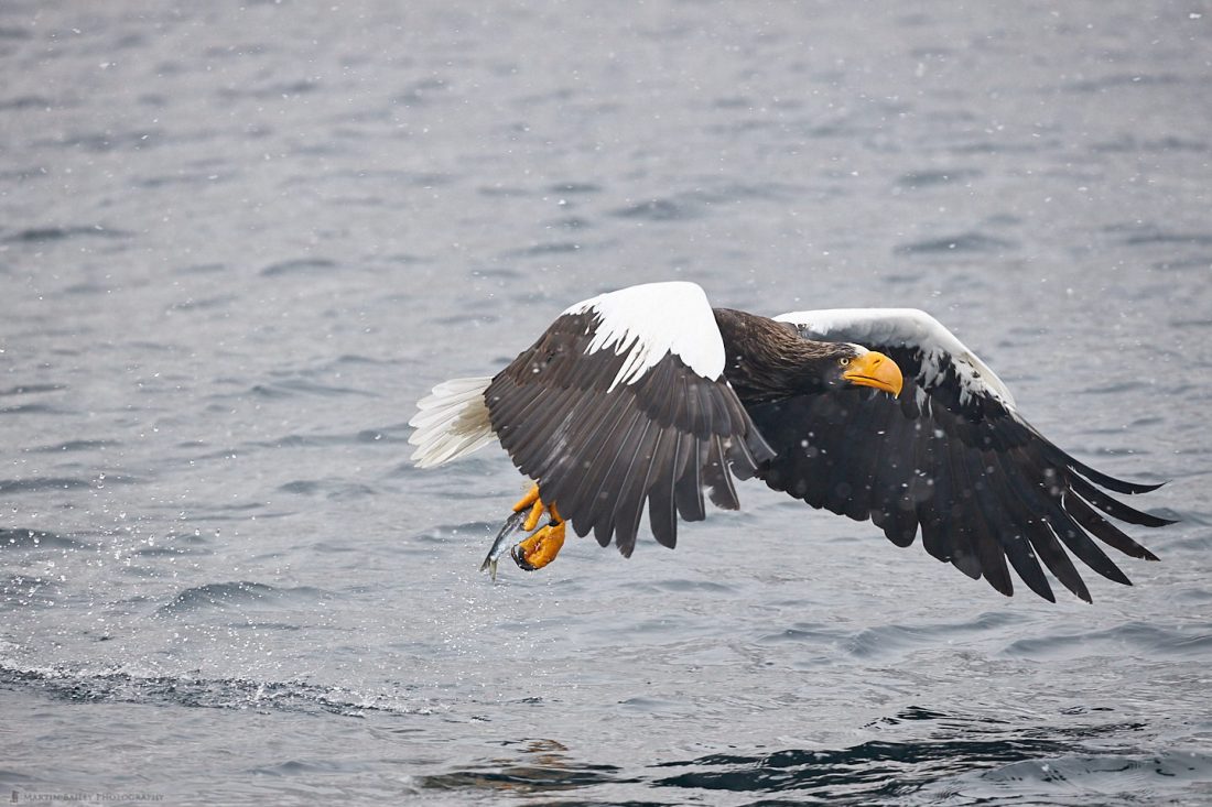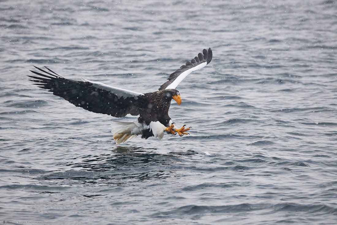 Here is a shot of a Steller’s Sea Eagle as he reaches out with his talons shortly before pulling the fish out of the sea. This is literally a moment after I framed the bird up and focussed on it.