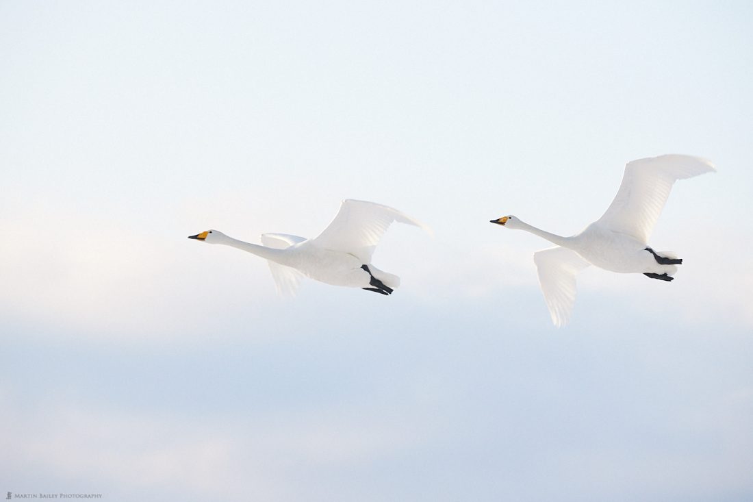 After the cranes, we headed over to Lake Kussharo where we photograph the Whooper Swans for two days. We made our customary stop at Lake Mashuu on the way, and stopped at a corner of Lake Kussharo for an hour before lunch, then having checked in and got our rooms sorted at the hotel, we went back to the lake for our panning session to end the day. Before the sun dropped behind the mountains though, we were treated with a fly-by at a good height, allowing me to shoot this next photograph.