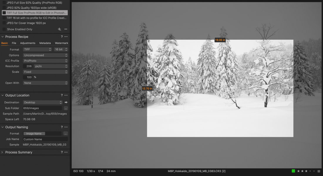 Without setting the Resolution the crop size readout is inaccurate, so the recipe resolution is important. Once set, I just resized the image to 19.05 inches, and we’re ready to print. For the 5Ds R image, I did exactly the same but with the resolution set to 266 instead of 206 to compensate for the higher resolution of the base image.