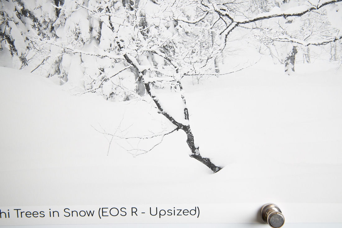 Here is a photograph of the twigs to the right of that central large tree, for each print. On the left is the EOS R image print and the right is the 5Ds R print. As you can see, even in a 36-inch fine art print, the EOS R is slightly sharper, and this is without any additional processing. The settings are the same as I shared above, but the page size has been changed. The Sharpness slider remained at 25 for both of these prints.
