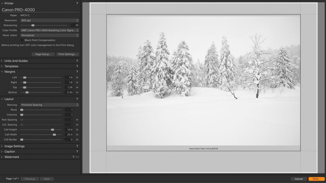 You can also see the width of the cell that holds the image is set to 20.4 inches, as I mentioned earlier. I’m printing with my own ICC profiles on Breathing Color’s Signa Smooth 270 fine art matte media. Matte is generally not as sharp a media as gloss, but it’s what I prefer to print on, and in my opinion, the better way to evaluate a print from a fine art perspective, and that is always my ultimate objective.