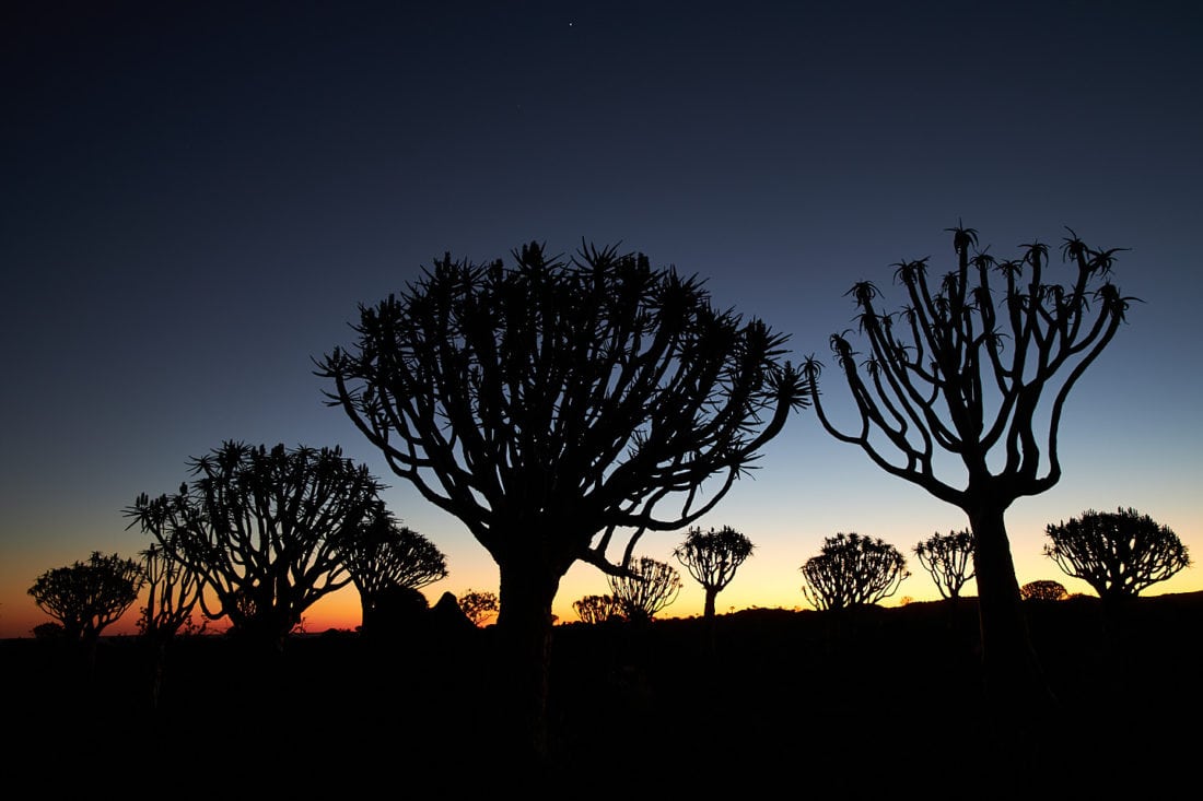 As the sun got deeper below the horizon, I shot a few final images with the warm glow just along the bottom of the frame, transitioning gradually to the indigo of twilight at the top. Here too I abandoned my desire to keep each tree separated in order to get these many different quiver tree forms in the frame, including many of the trees which were flowing.