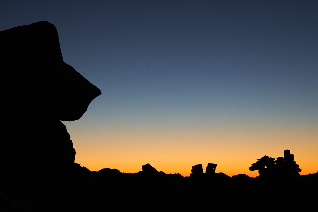 The following morning, we got up bright and early to head out to the Giant’s Playground looking to capture this kind of image, again a silhouette, but this time of the comical faces that we can find in the dramatic rock formations of the Playground. It’s literally like giants have placed these rocks so that they look like faces. If you were in the UK in the 70s and 80s you’ll probably recognize the late Bruce Forsyth with a trilby hat on looking up at Venus from his pile of rocks, Shrek is also peering up at Venus from just right of center, and of course, the baboon or Easter Island statue is pretty prominent on the left side of the frame.