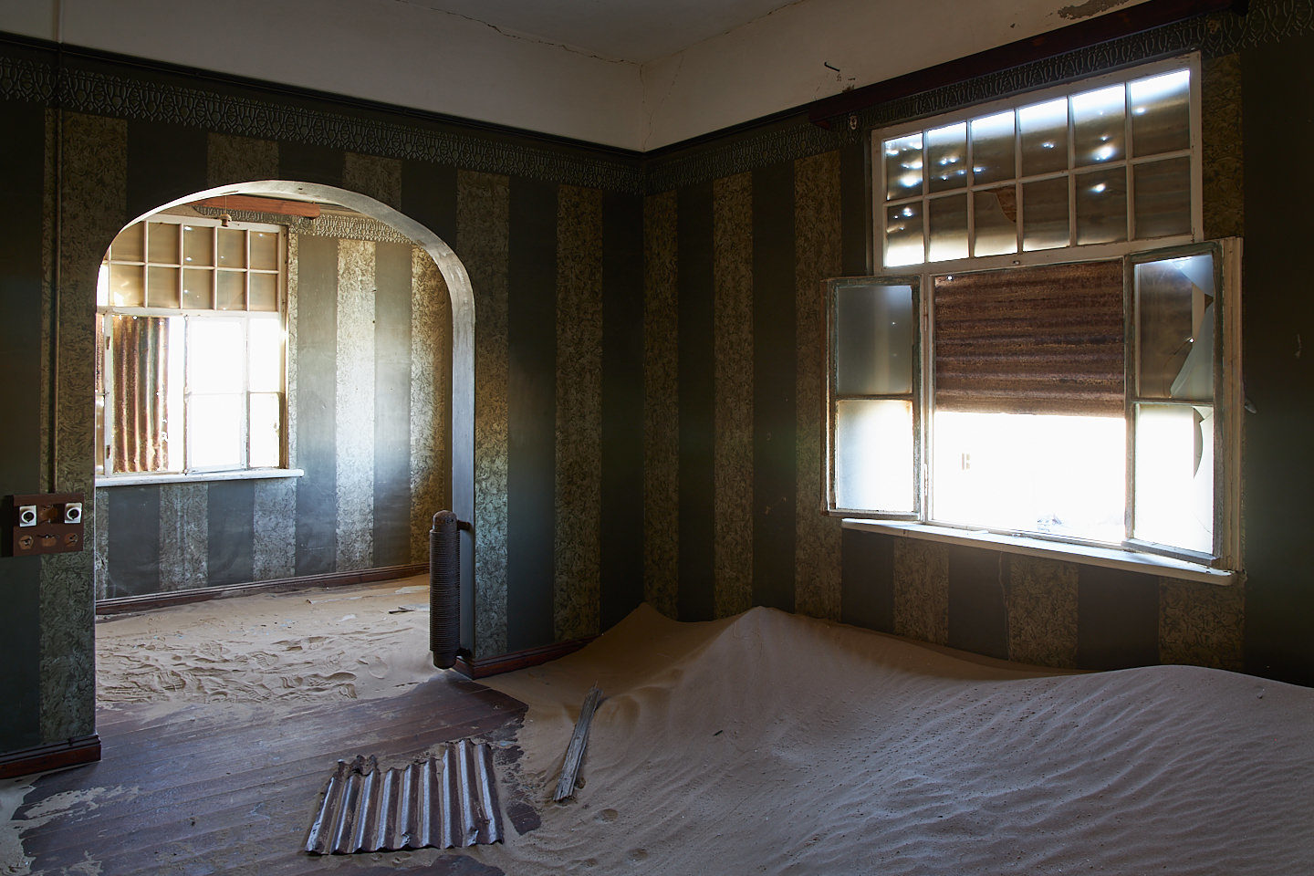 Maybe the owners of Kolmanskop are gradually clearing the entrances to some of the rooms that are still in relatively good condition, as the roofs cave in on other buildings, gradually taking them out of commission, or maybe I just missed it, but I did enjoy this room, with its vertically striped moss-green wallpaper. I also liked the half-sheet of corrugated steel on the floor, and as I’ve mentioned before, I generally like to allow the light from the windows to glow like this, rather than trying to let the viewer see outside, as I feel this adds to the mystery of the image. My settings for this were a 1-second exposure at f/14 with ISO 100 and a focal length of 24mm.