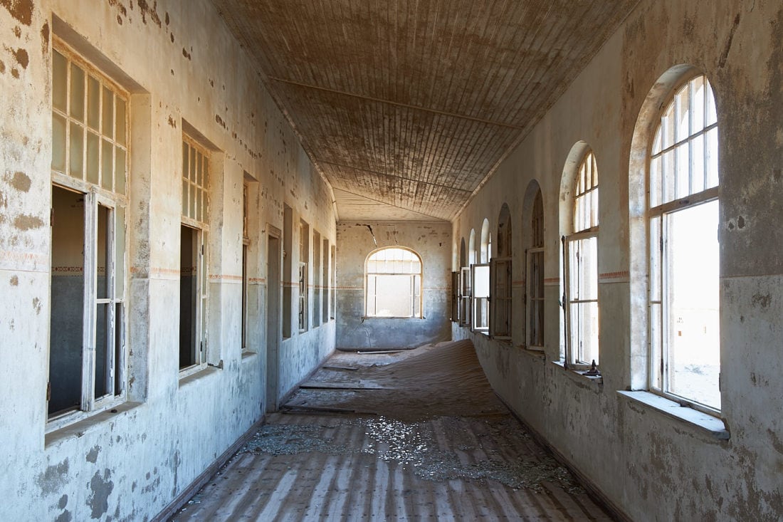 I mentioned earlier that I like the glowing windows unless there is a story to tell by being able to see outside. Well, this is probably the first photo I’ve shot at Kolmanskop where I felt there was a story to be told by being able to see out of the window. I went through one of the rooms in the hospital and found a corridor at the back with windows that looked out across the desert, with some of the distant buildings of the entrance to the Elizabeth Bay diamond mine, that we would visit later this day.