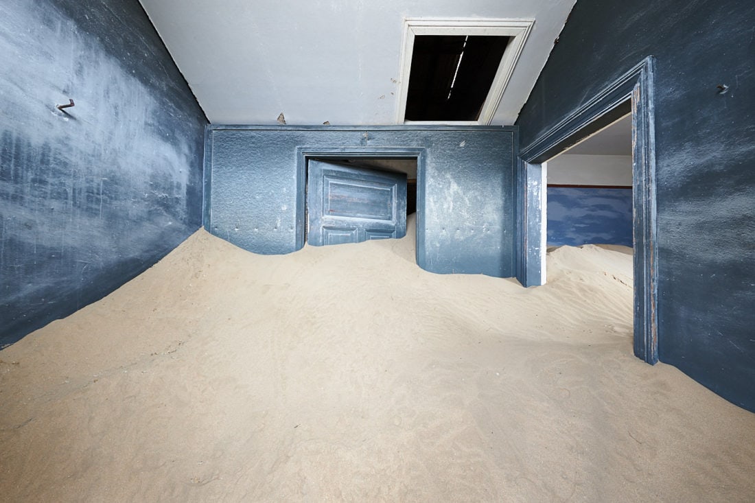 I really like this room, so full of sand, yet still in relatively good condition. For this shot, we literally have to just shoot through a broken panel in the wooden door, which will never be opened again with all this sand pushing back against it. For this perspective, I also used my Canon EF 11-24mm lens, almost wide open at 12 mm, being careful to get the back wall square in the frame, but allowing the wide lens to cause all of these great diagonal lines of the side walls and ceiling. I also like how we can see into the second room with its healthy amount of sand against its blue wall as well. My other settings were f/14 for a 4-second exposure, this time at ISO 400, because the wind was gusting a little, and I didn’t want to risk a longer exposure.