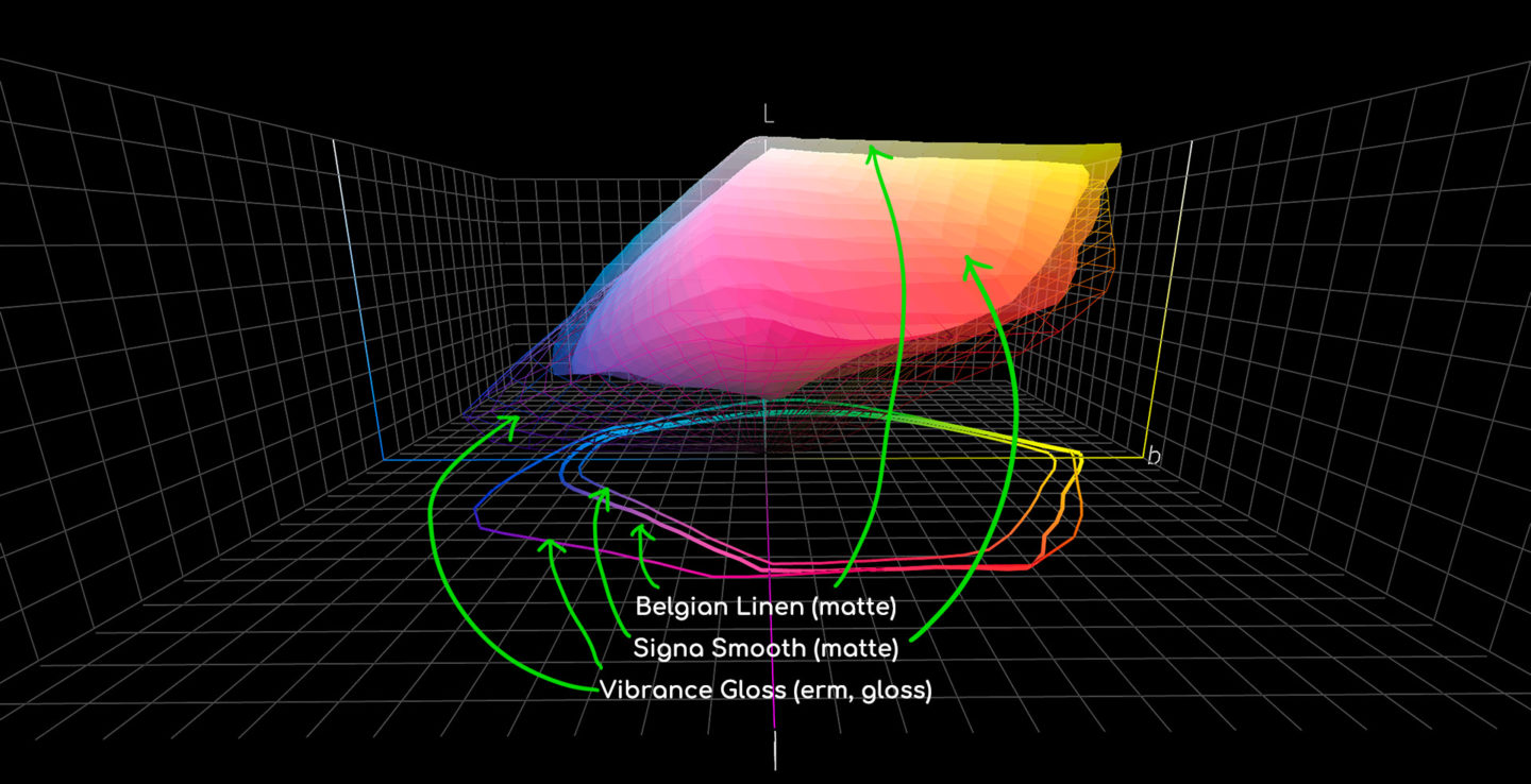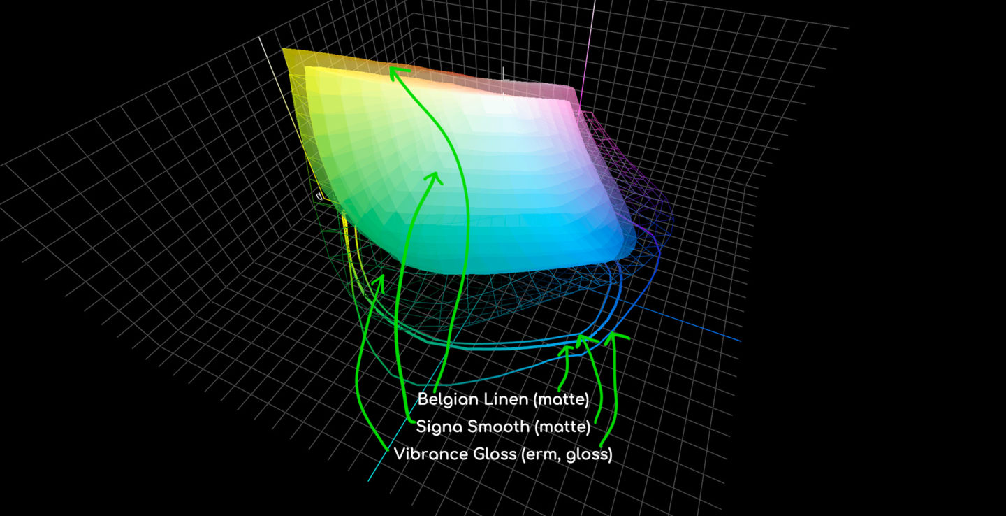 In Wire-Frame, I’ve actually included Breathing Color’s Vibrance Gloss, to show you that gloss media is generally going to give a wider gamut, and you can see by how low the wire frame goes, that the darkest black that Vibrance Gloss will provide is much darker than its matte cousins, but for matte media, the other two are still very, very respectable.