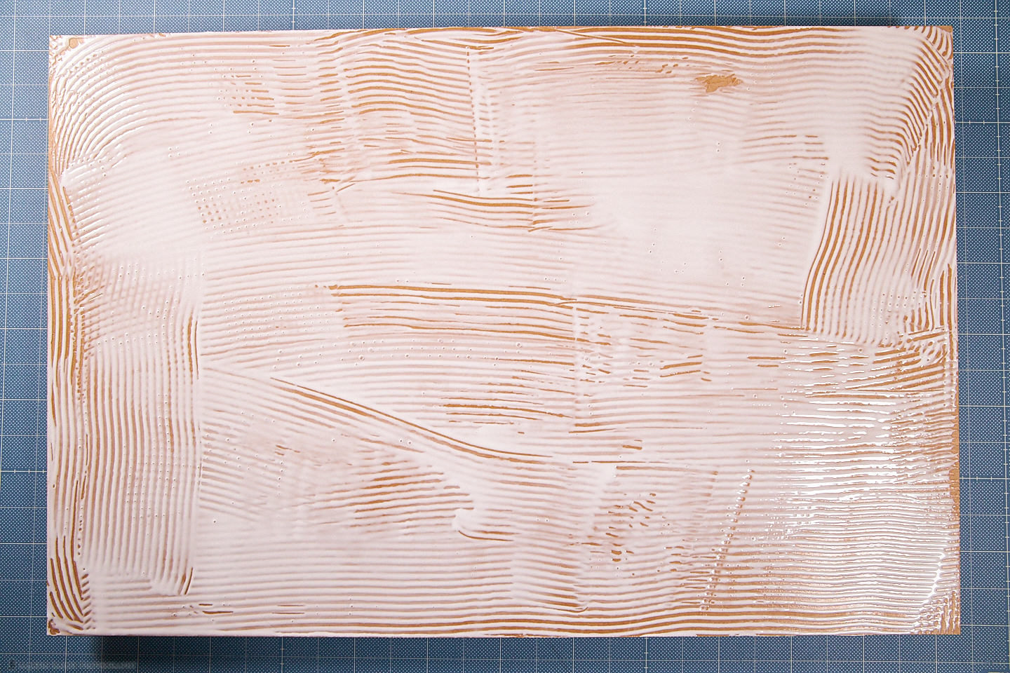 Having squeezed plenty of glue onto the face of the panel, I then scraped it out with the toothed spatula, as you can see here.