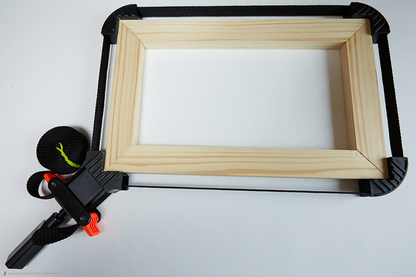 Once you have your four bars cut, match them together to get the best fit, and apply your wood adhesive to the ends where the bars need to be fixed together, and then clamp them together. I use a $10 band clamp for this, which works very well, but you might be able to use other clamps, or maybe even screw this frame together. Ensure that if use adhesive you check how long you need to keep the wood clamped together. My adhesive was good to work the wood in one hour, but requires 24 hours to fully set.