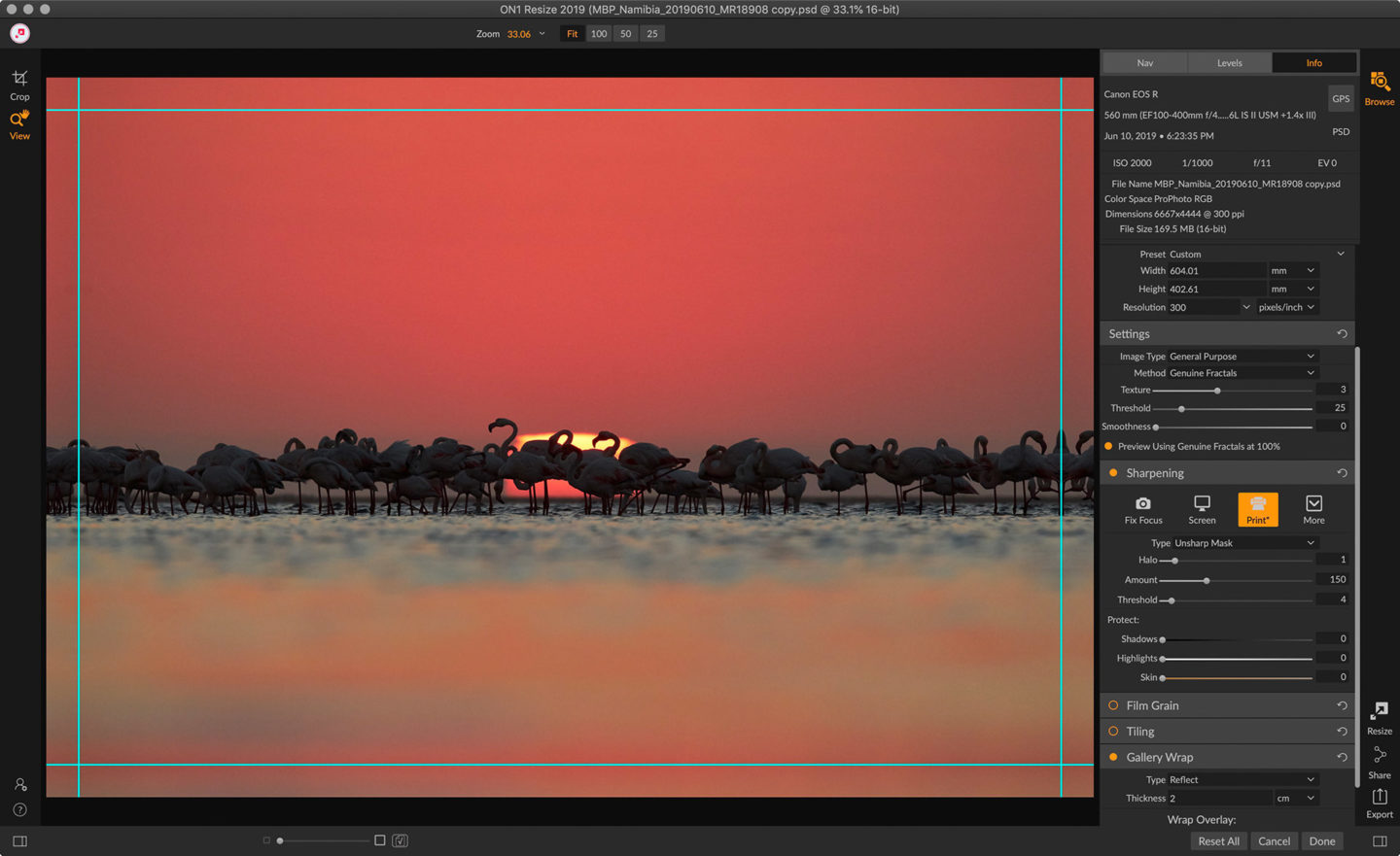 For this, I use ON1 Software’s Perfect Resize. You can launch Perfect Resize from within Capture One Pro, Photoshop or Lightroom etc, or simply export a PSD or TIFF file and open it in standalone Perfect Resize. As canvas can shrink a little when when we apply glue later, I need to add about 4mm to the width, so I enter 604 mm in the width field and because I have Constrain Proportions turned on, Perfect Resize automatically calculates my image height.
