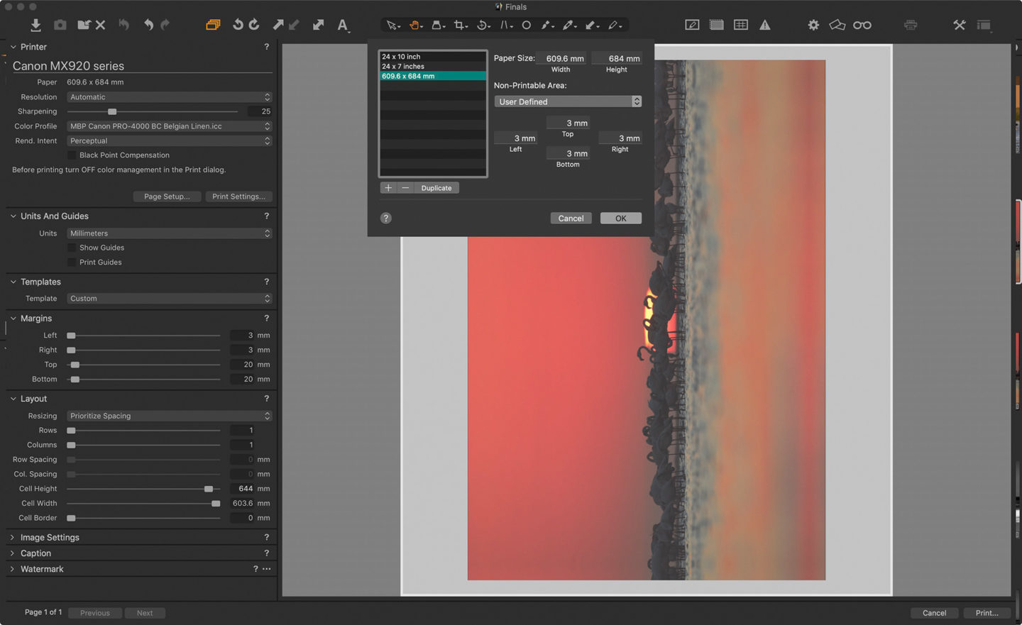 As you can see, I created a custom page size in the Canon PRO-4000 printer drivers that is 609.6 mm wide, which is 24 inches, to match the roll width. I then specified the height of the page as 684 mm. To recap, my panel is 600 mm wide, and I added a 2 cm reflected border in Perfect Resize, and I told Perfect Resize to add a further 4 mm to allow for the canvas shrinking when we put glue on it. So that’s 600 + (20 x 2) + 4, for 644 mm. Because there is plenty of leeway on the 24-inch roll, we don’t really have to worry about the sides. Note too that I have my new ICC Profile selected and the Rendering Intent set to Perceptual. Most of the time for photographic prints, Perceptual will be what you need to select, although there are exceptions.