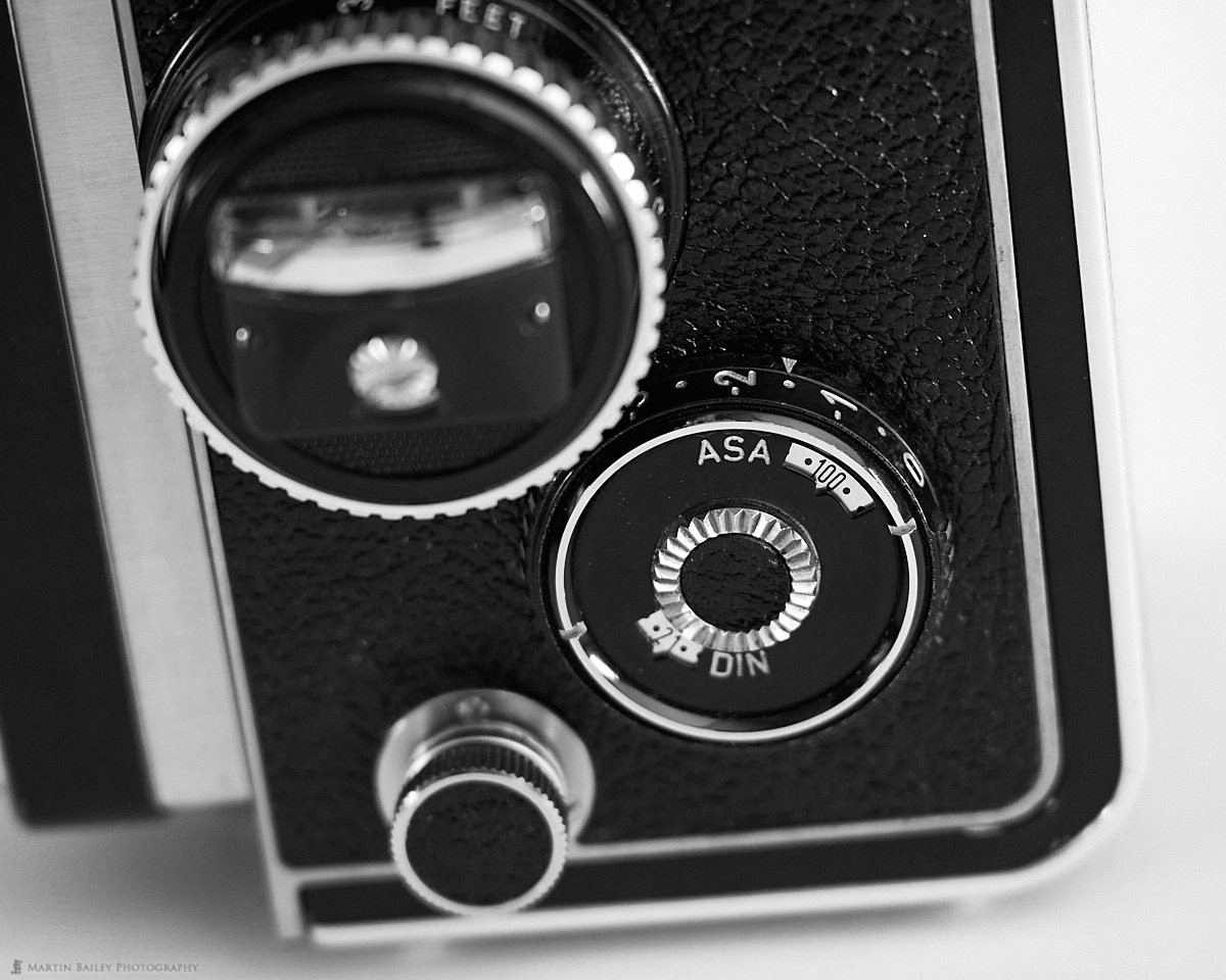 Of course, the other parameter that affects exposure is the ISO of the film in use, and the Rolleiflex takes that into account when calculating exposure. Here you see the ASA and DIN dial, and ASA is basically the same as our current ISO standard, so you can see here that I have the dial set to 100, as I have an ISO 100 film loaded right now.