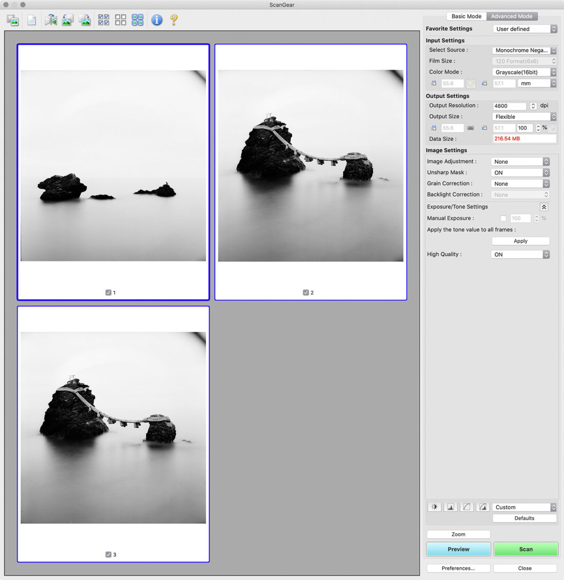 To enable higher resolution scans, when you first start the scanner software by opening the Canon IJ Scan Utility application and then clicking the ScanGear icon, switch to the Advanced Mode, then open the Preferences panel. Under the Scan menu Advanced Mode Settings section, enable both the Enable Large Image Scans checkbox and the Enable 48/16 bit Output checkboxes. Without these options, the scanner will only provide relatively low-resolution scans of medium format film.