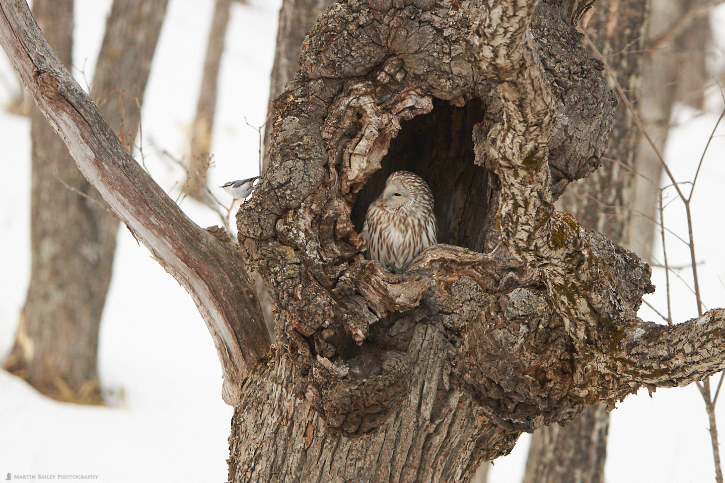 The next image is also from my Winter Wildlife Tour and I was attracted to this more than anything by the serendipity of owl’s attention being caught by the scratching of the nuthatch that was scuttling around on the side of the tree. The owl wouldn’t have been able to see the small bird from its vantage point, so it must have been the sound that alerted it to the nuthatch’s presence.