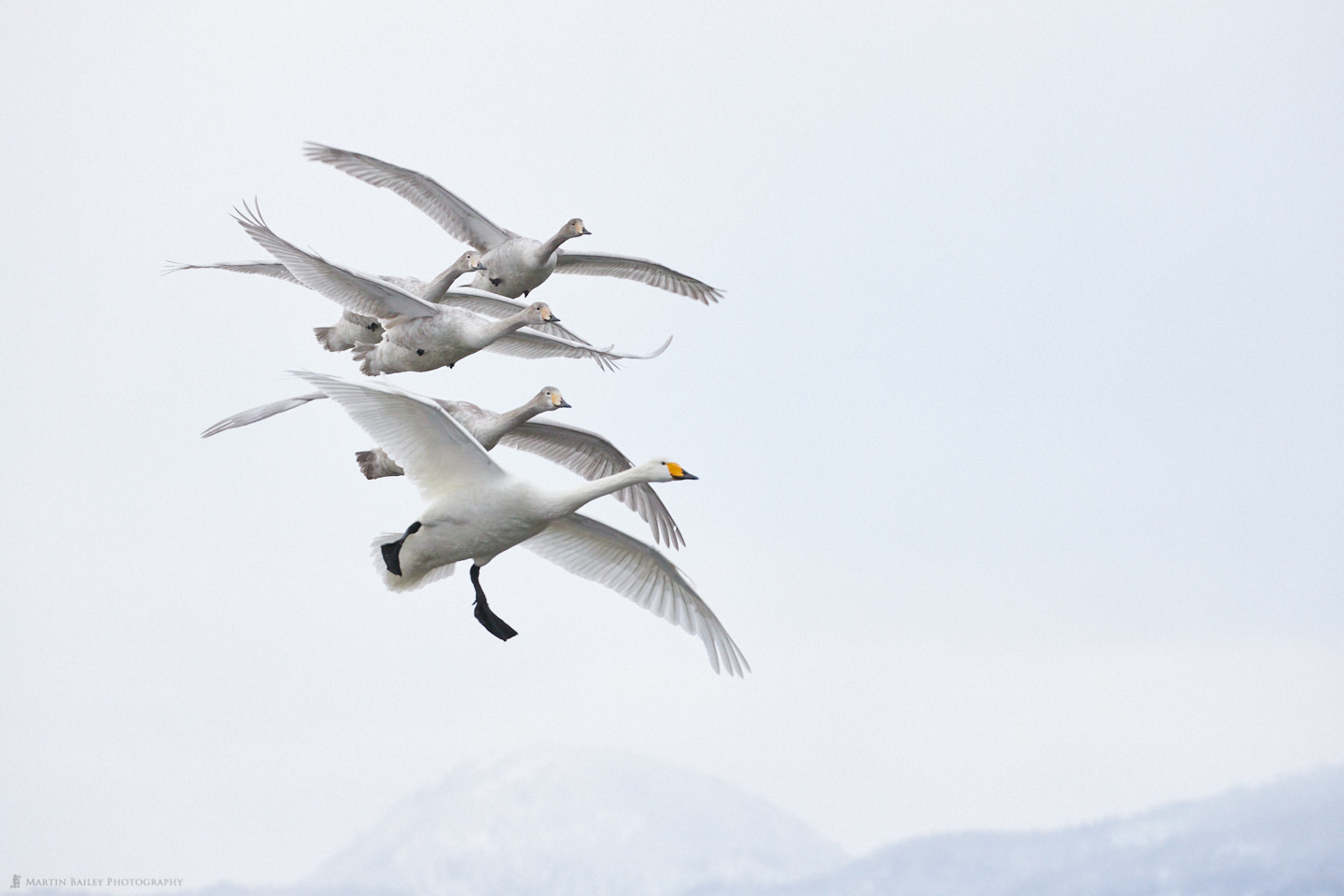 For this shot, I pulled back on my Canon EF 100-400mm lens opening it up to 100mm to include the wider group of birds, but also pointed the camera upwards slightly, to include the top of the mountains on the far side of the lake. We also have that band of shimmering light along the horizon line that we often see caused by the cold air above the lake.
