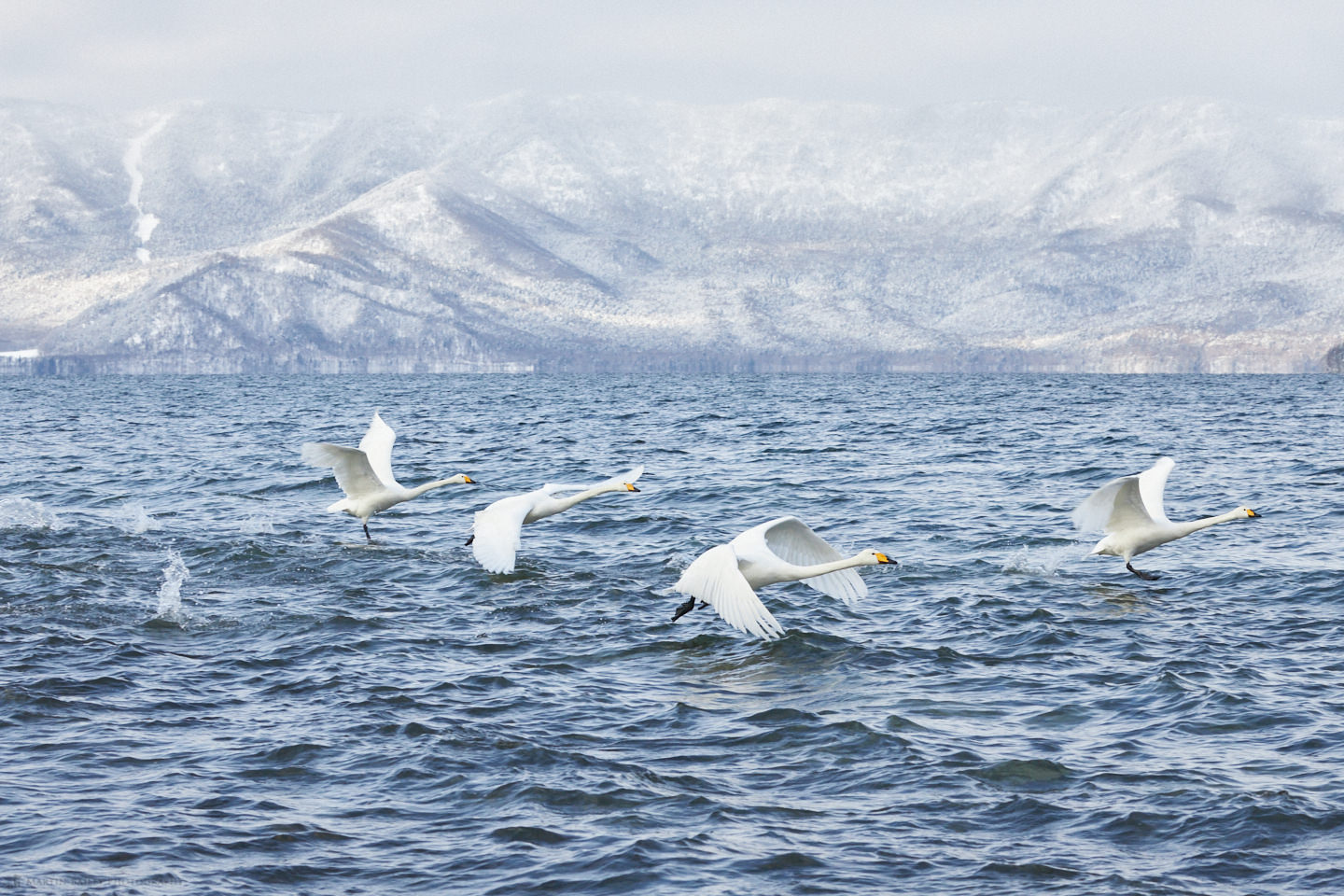 We pick up the trail on February 2, as we arrived at Lake Kussharo to photograph the Whooper Swans. In this first image for today, we see one of the parents leading in four cygnets, as they flew to the area where the beach is warm and the lake is usually thawed there for a strip, from geothermal activity. It’s nice to see the swans raising such large families. Four is, I think, the most I’ve seen in one family here in Japan, though I have seen two adults with seven cygnets in a remove lake in Iceland, in 2015 or thereabouts.
