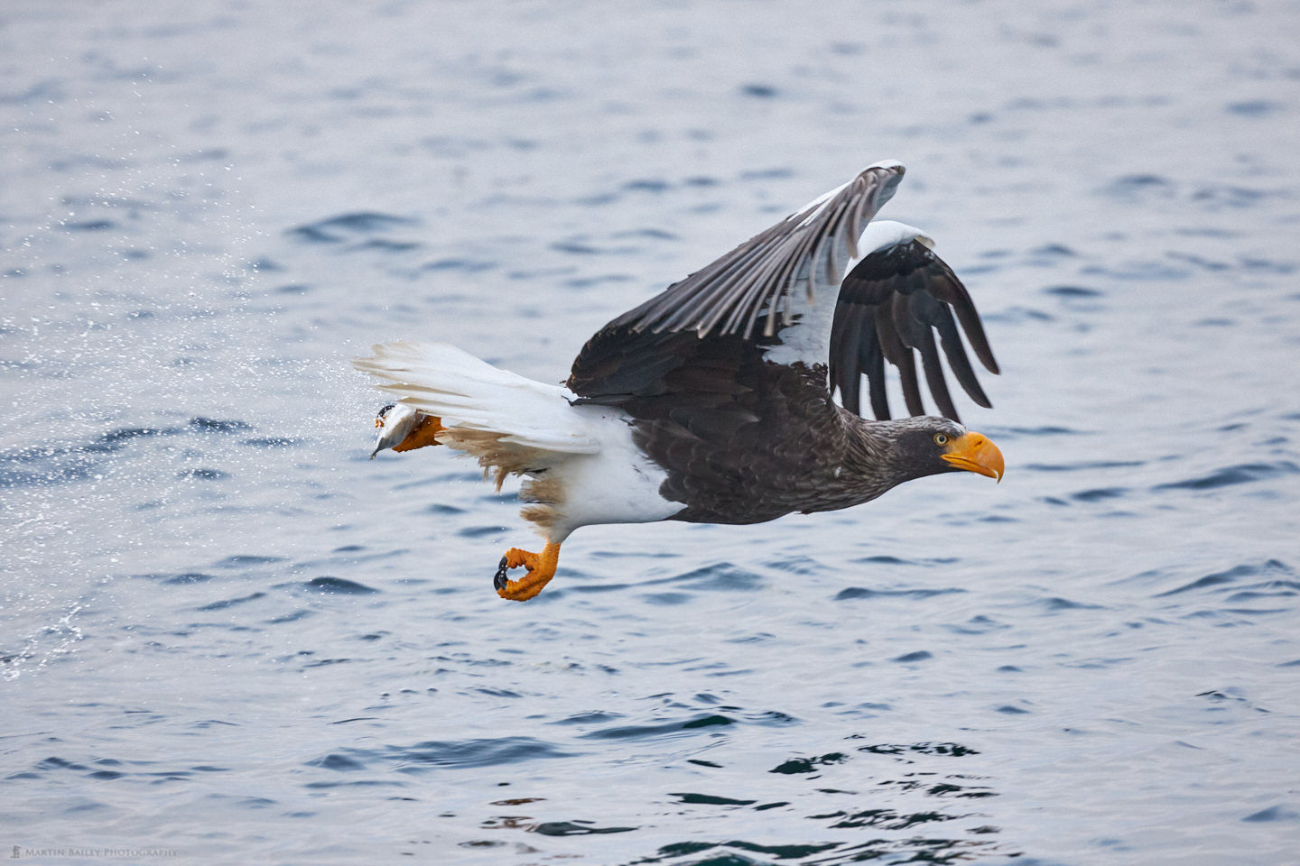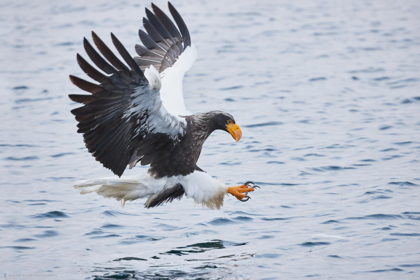 Without doubt, my favorite photograph of the trip is this next one, which I shot at the end of the third eagle shoot on the third and final day in Rausu, We pulled the boat up alongside the quay wall, and because that has snow on it, the light is bounced back up onto the underside of the eagles putting them in beautiful light. I was really close to the bottom of the tail in this shot, so I’ve cropped it in a little from the top too, to balance it out, but I love the detail in this image, and how the flight feathers are spread as he tries to control his flight so close to the wall.