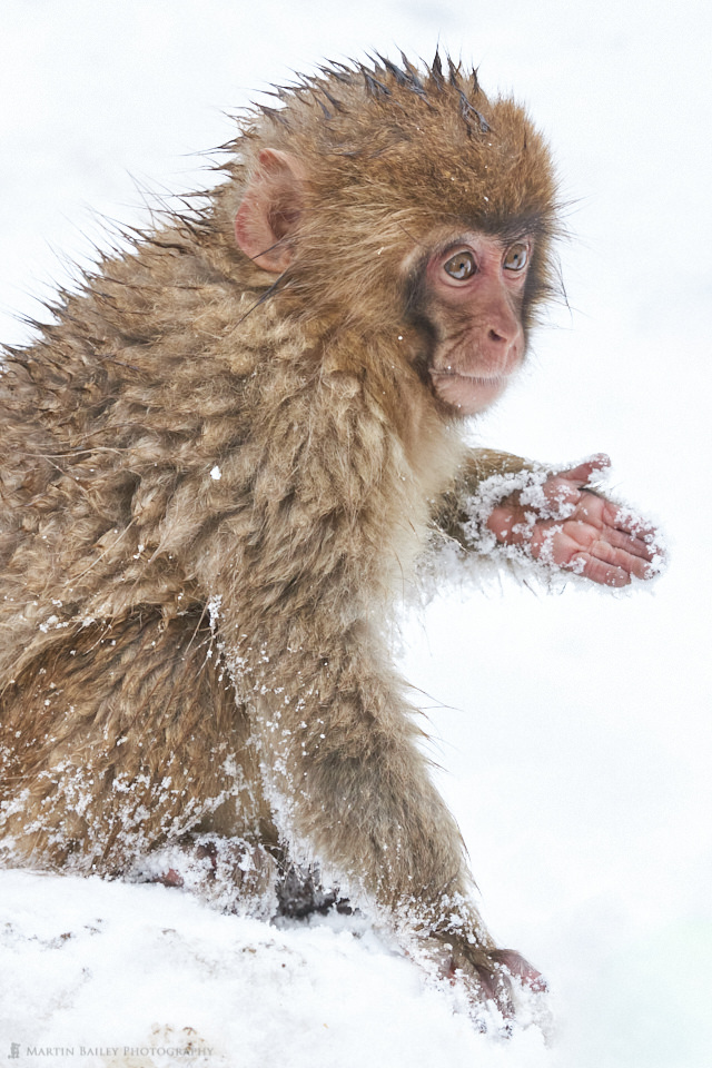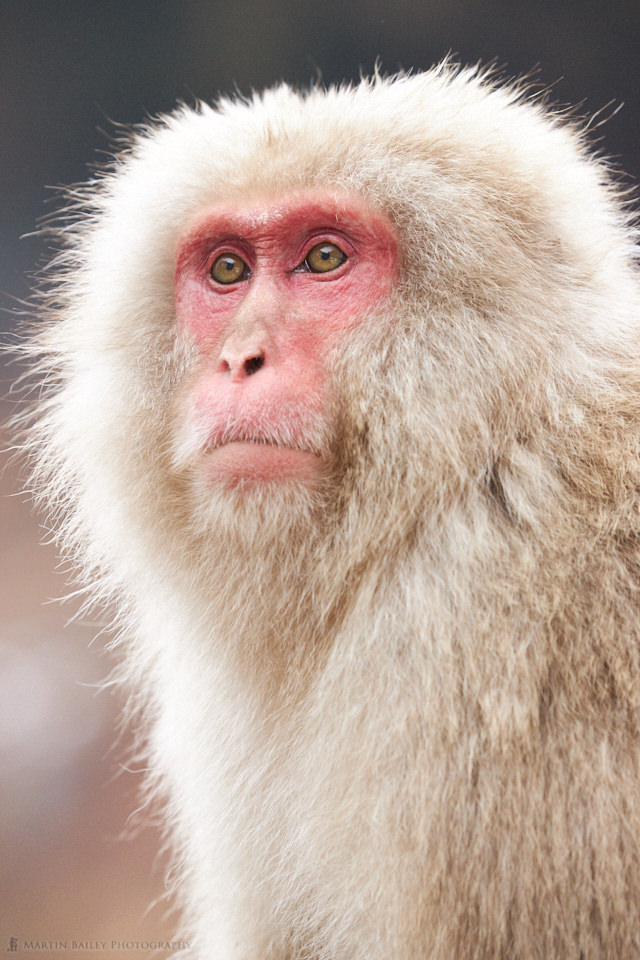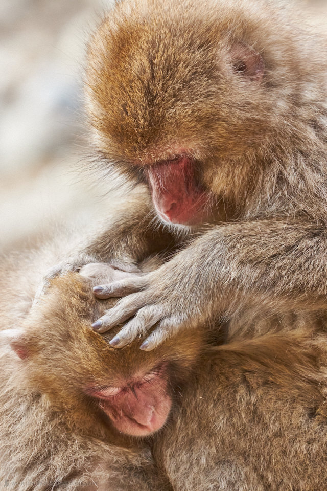 On our first day, we were treated to a pair of young monkeys grooming (below, left), and I just love the pensive look on the larger monkey’s face here, but more so, the completely relaxed, almost meditative mood of the monkey being groomed. I also really like the background in this shot too. Once again, it was far enough away to be nice and blurred, but the pale brown tones make a nice change from the white, as much as I do love it when these guys are against the snow.