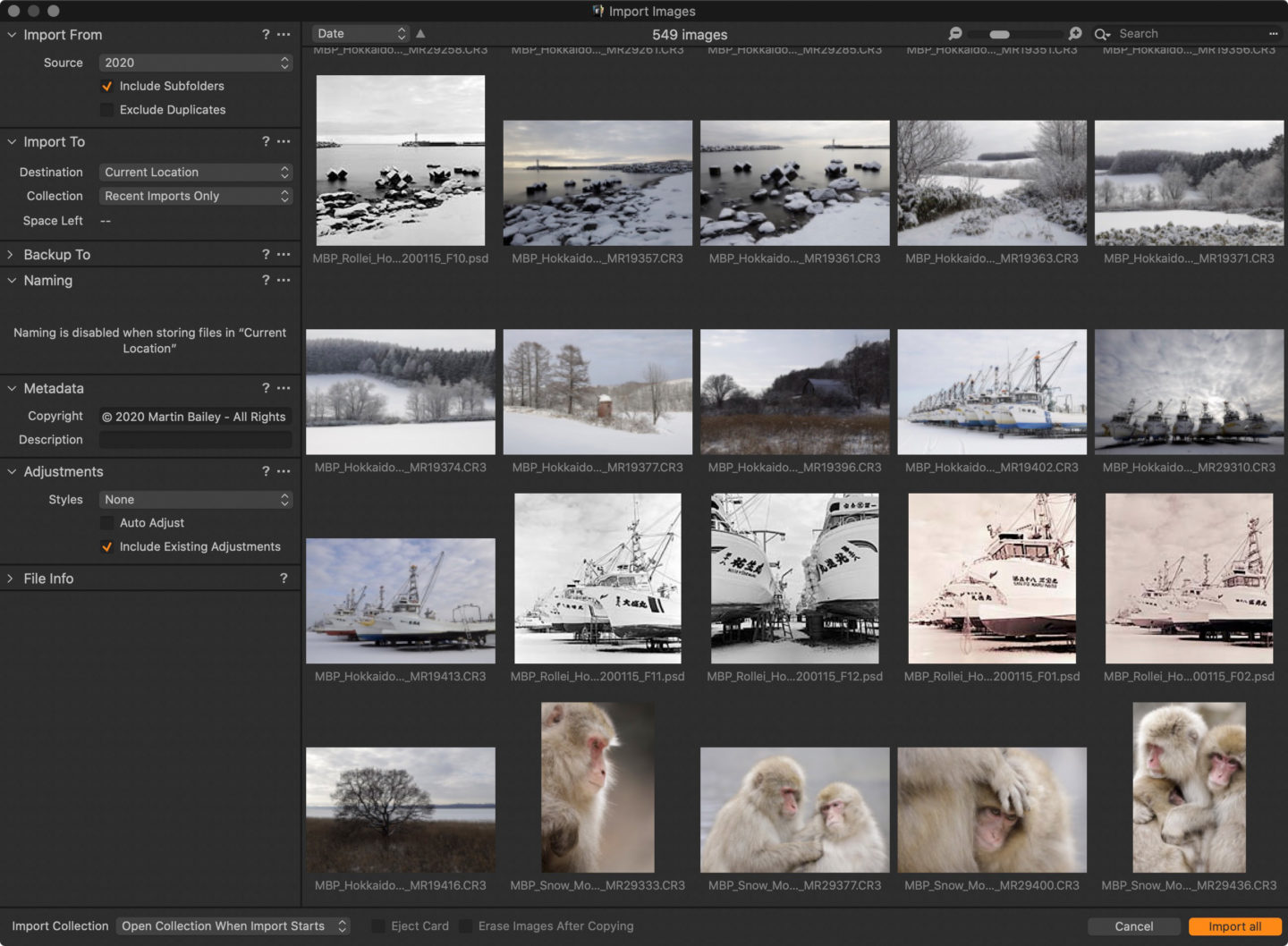 You can’t actually see the adjustments in your images in the import dialog, but once you have completed the import, all adjustments will be applied to the images and so we don’t have to redo any work that we did on the images on the original drive.