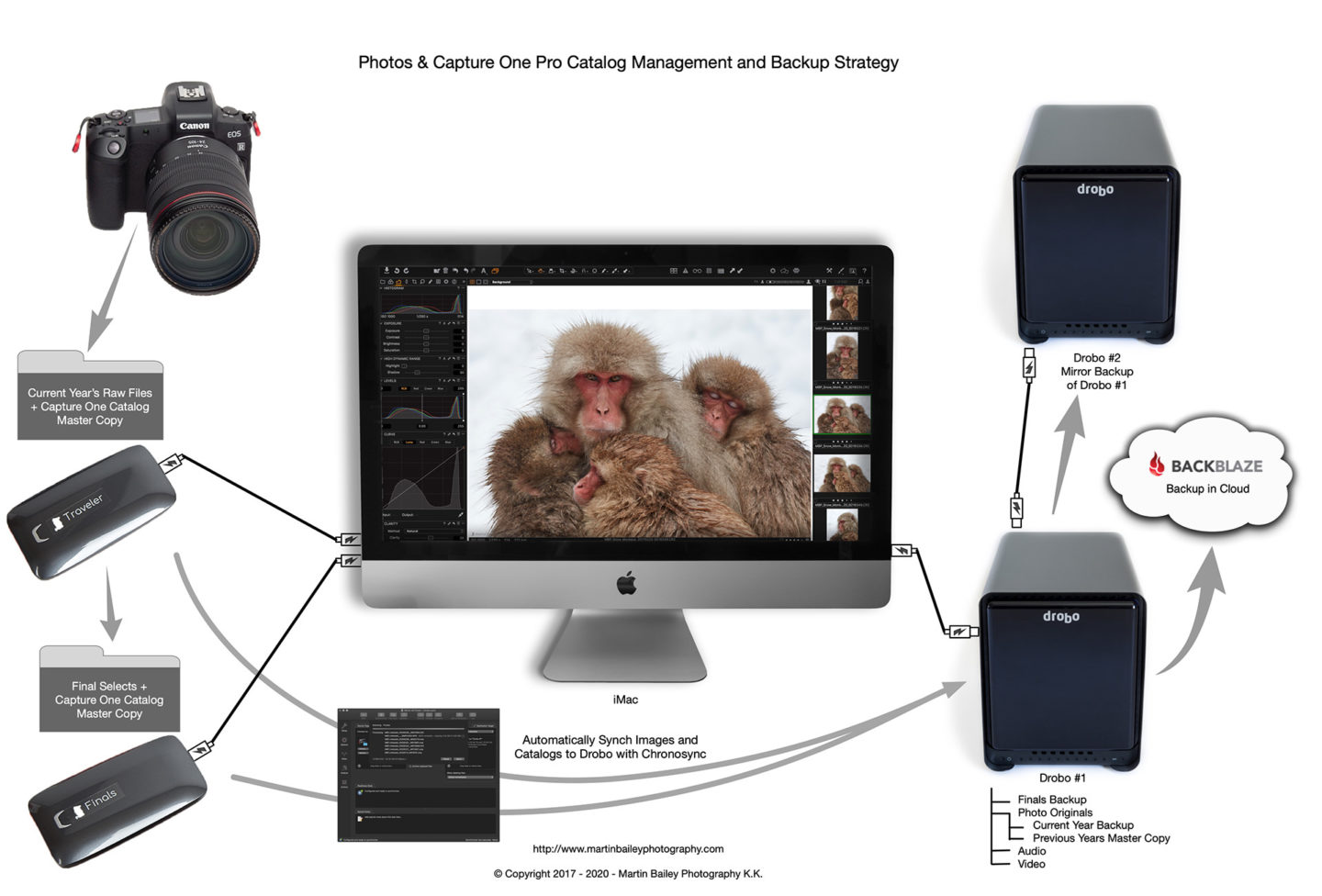 When I get home from a trip, I plug the Traveler into my iMac Pro, and that kicks off a Chronosynch job I’ve created to synchronize my new images and updated Capture One Pro catalog to my Drobo. On my iMac I’m running Backblaze which then starts to transfer my new images and catalog into the cloud. This can take a while, and I have to choke the upload speed a little so as not to get my Internet connection crippled by my stingy provider, but even after a wildlife trip with thousands of images, within a few weeks of getting home my new work will be backed up in the cloud.