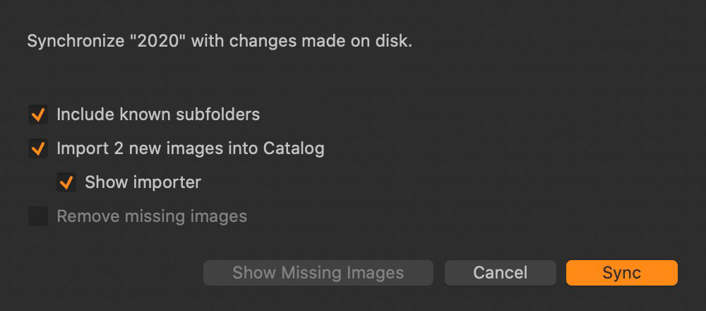 That did give me the opportunity though to show you how updates are handled for the rest of the year, as I now have a 2020 folder in my Finals catalog, so all I have to do after copying any new work across is right-click my 2020 folder and select Synchronize. I find that it works better to select Show Importer on this dialog, as some changes to files have not been reflected when I haven’t done this in the past, although I haven’t checked recently to see if that is still a problem.
