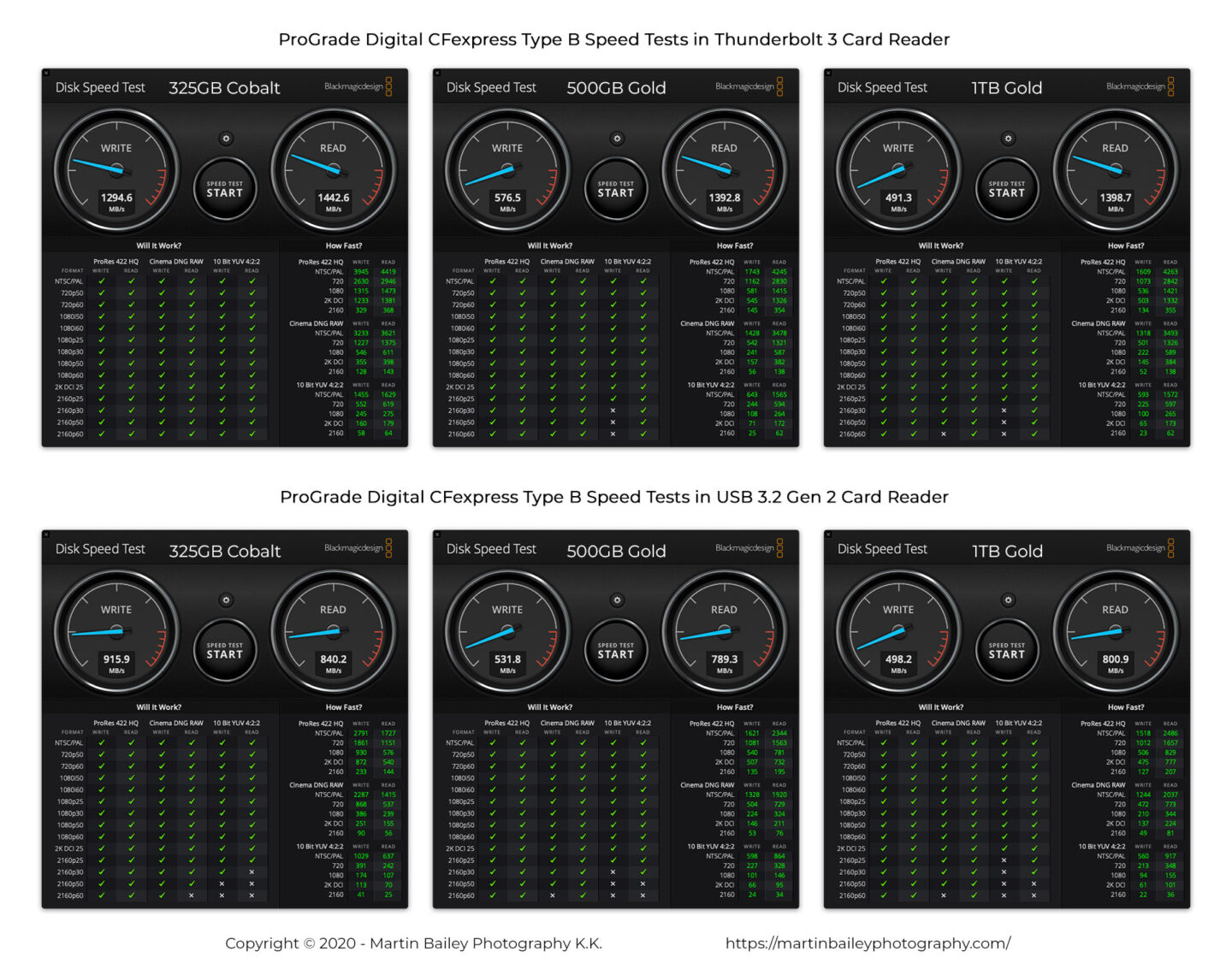 And for good measure, I’ll also share the Black Magic Design Disk Speed Test results for the CFexpress cards merged together into a single image.