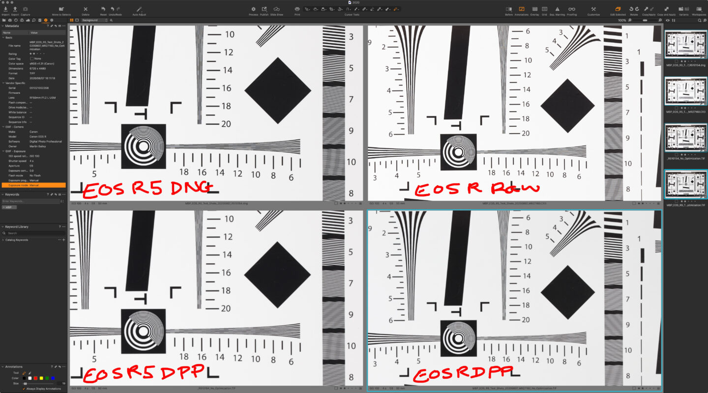 Because Capture One Pro does not yet support the EOS R5 images and there is a problem with using converted DNG files with Capture One Pro, I’m faced with a bit of a dilemma. I tried outputting TIFF files from Canon’s Digital Photo Professional, but the image quality is not as good as Capture One Pro, which is, of course, why I use Capture One Pro, but I need to show you an apples to apples comparison. What I’ve decided to do for this test, is to share a high-resolution screenshot of four images displayed simultaneously. The top left image is the EOS R5 raw file converted to DNG, and for this test that’s not a problem because the image has no color to get messed up.