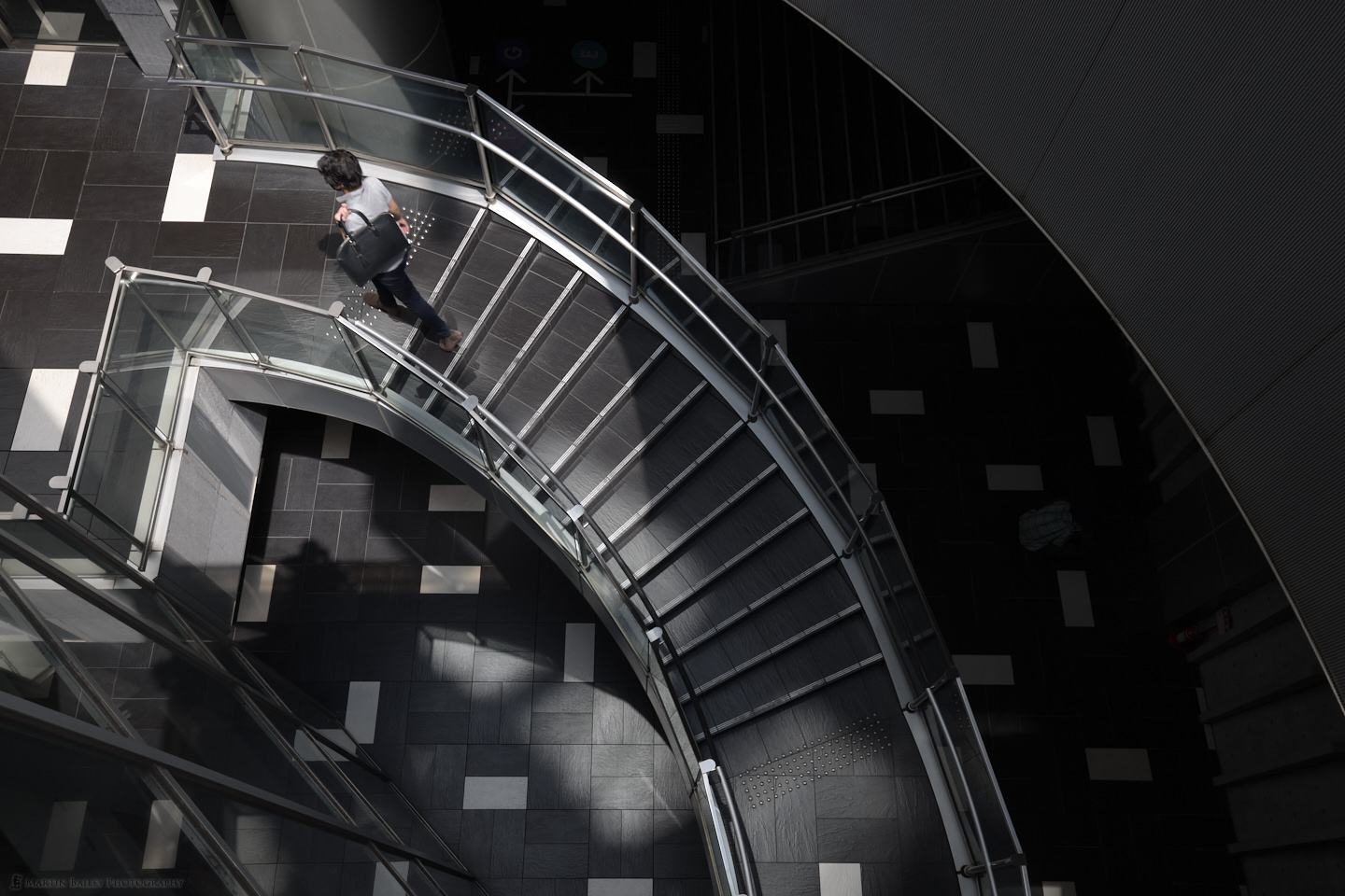 Here (below) is another test shot, this time looking down the stairs of the Cocoon Building. I like to shoot this as a test because it gives me a good idea of how well the camera handles contrast and shadows. I increased my ISO to 160 for this to get a shutter speed of 1/100 of a second. I was using my new RF 15-35mm f/2.8 L lens with IS, which, coupled with the new in-body IS of the R5 gives me a total of 7 stops of image stabilization, but I didn’t want the person walking up the stairs to blur more than this.