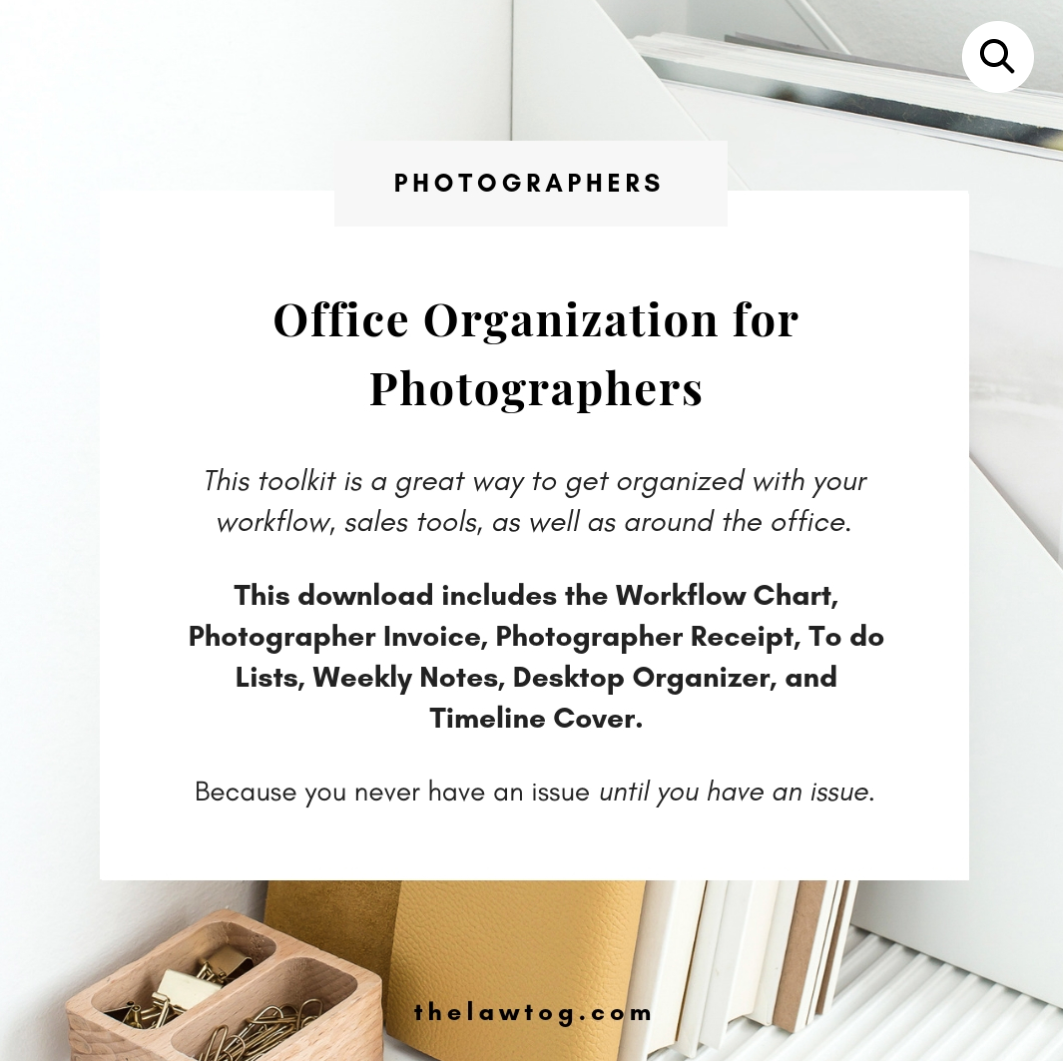 Another great tool is Office Organization for Photographers from The LawTog, which helps you to manage business finances and general office organization.