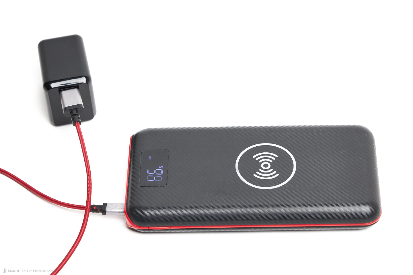 The other big benefit is that with batteries set into the dual charger, I can actually plug in a USB cable and use those batteries to charge something else if I was in a fix. I’ve never had to do that, but I have used a rechargeable battery pack to charge my Canon batteries while on the bus during my tours, and that can be a lifesaver on long wildlife photography days. The rechargeable battery is the second item that I wanted to recommend, and it’s amazing because it not only enables me to charge multiple devices multiple times with a single charge, but it has a wireless charging port built-in.