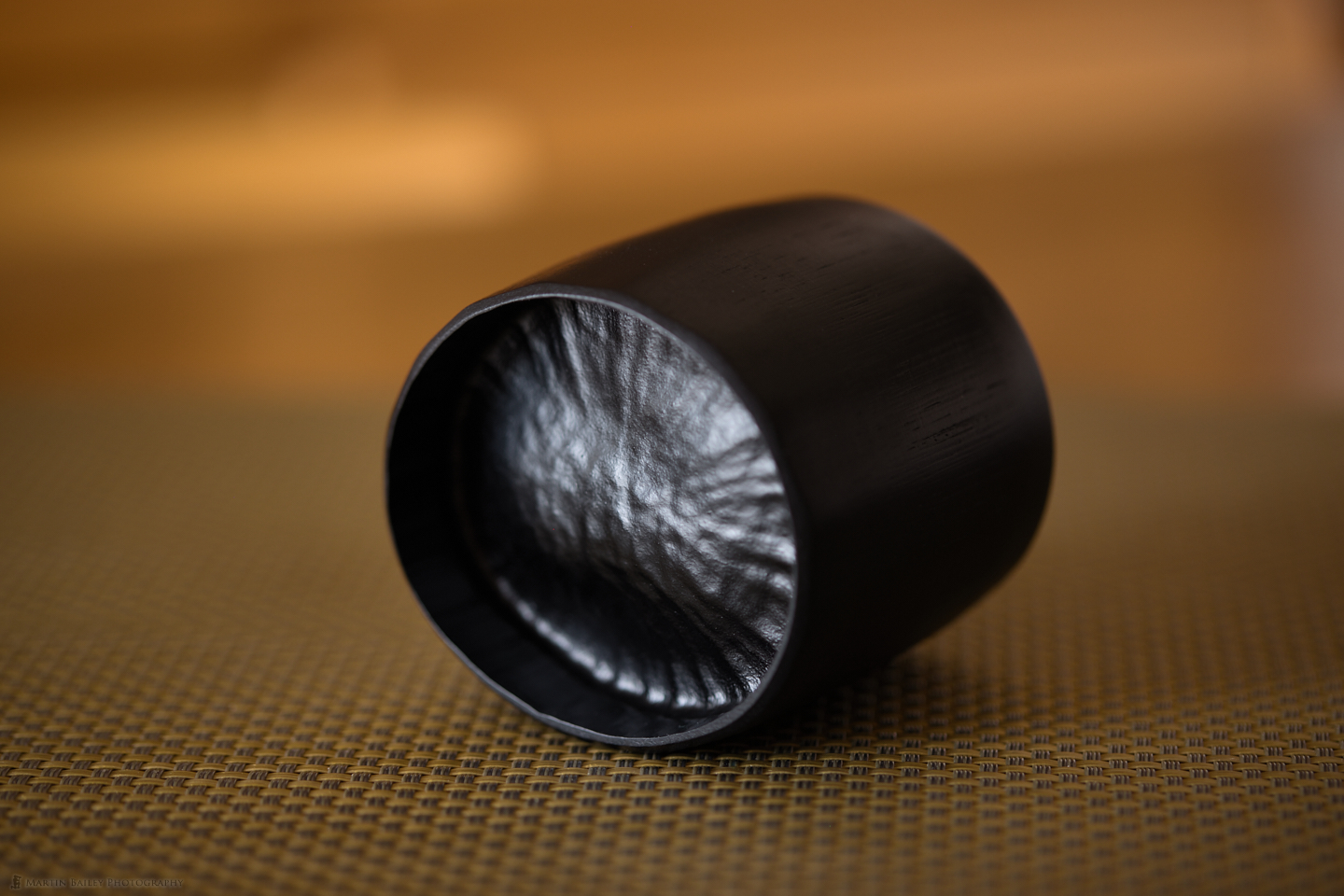 This next cup is made of a section of bamboo, treated with the lacquer also used for lacquerware, but here they’ve left the organic feel of the bamboo, and the lacquer almost has almost a matte feel to it. I use this one more often than not when I want to drink Sake, as in Japanese rice wine, from a larger cup than my Guinomi that we looked at earlier. I generally use the Guinomi when I sit with the bottle so that I can fill it up more often, but when I’m drinking something chilled or maybe relatively cheap sake from a carton, I will just pour it into this larger cup, and then I don’t have to sit with the bottle or carton.